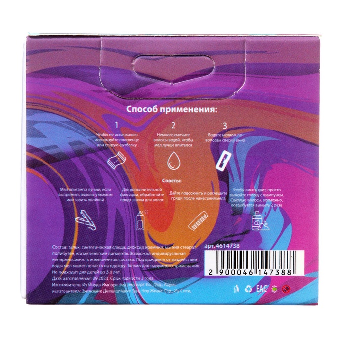Внимание: под дождем и от воздействия воды мел может попасть на одежду. Цвета: розовый, фиолетовый, зеленый, голубой. Состав: talc, synthetic fluorphlogopite, silicon silicate, magnesium stearate, silicone, polybutene, pigment. Возраст применения: с 3-х лет. Комментарии к товару