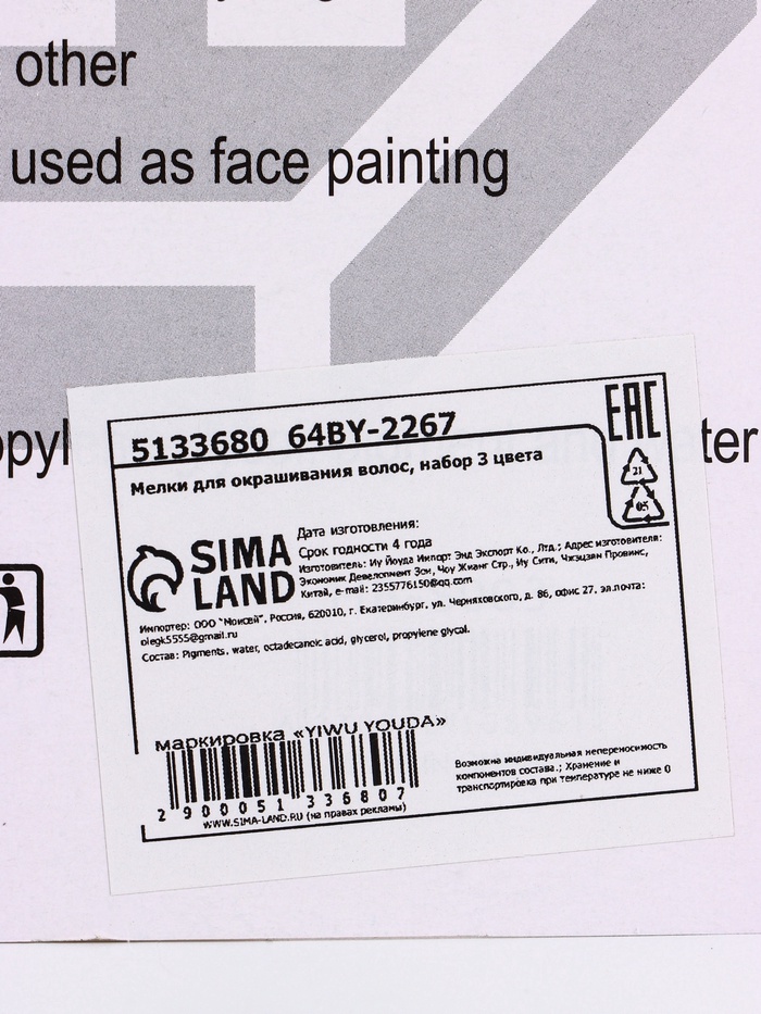 Внимание: под дождём и от воздействия воды мел может попасть на одежду. Состав: минеральное масло, вазелин, церезин, микрокристаллический воск, пчелиный воск, слюда, пигмент. Возраст применения: с 3-х лет. Комментарии к товару
