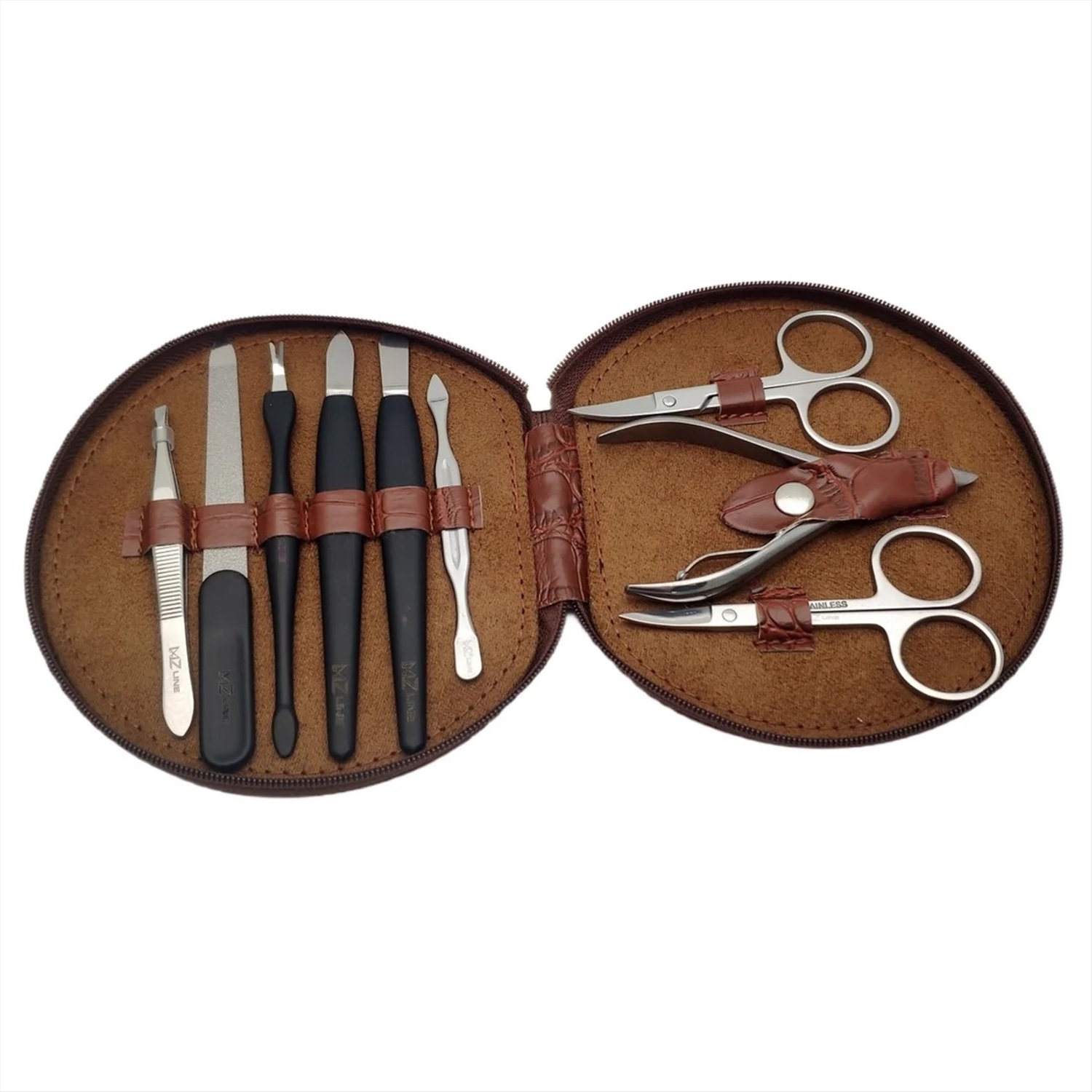 Компактный размер каждого инструмента позволяет легко хранить набор в сумочке или косметичке, что делает его идеальным для поездок и путешествий. Чехол набора выполнен из высококачественной искусственной кожи, имитирующей кожу крокодила, что придает ему элегантный и роскошный вид.