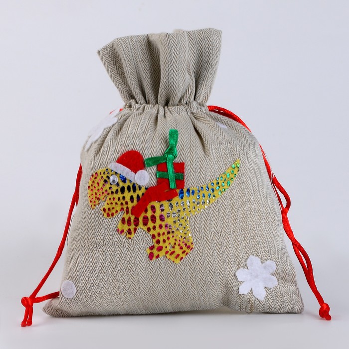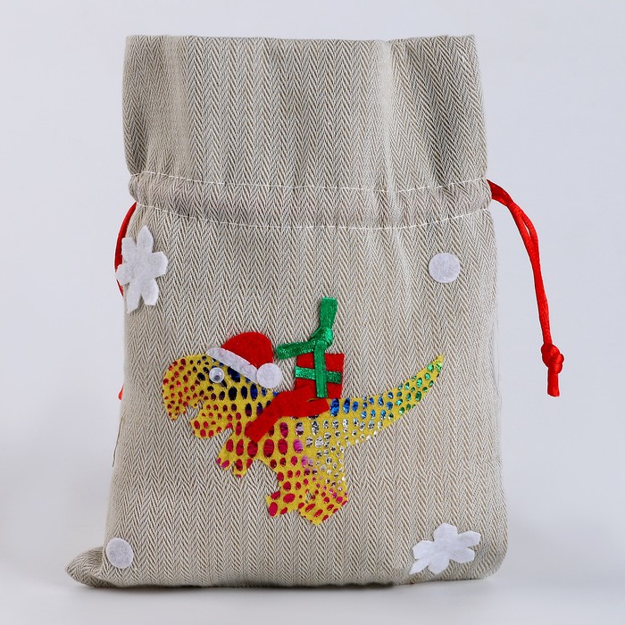Новогодний мешочек с изображением динозавра станет идеальным выбором для тех, кто хочет добавить ярких красок и особого настроения своим подаркам. Этот текстильный аксессуар не только украшает презент, но и бережно защищает его содержимое, словно маленький тайник, созданный для ваших сюрпризов.
