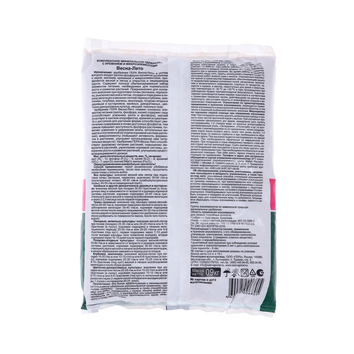 Габариты: 20 x 15 x 5 Доставка: Платная Страна: Россия В боксе: 25 шт Состав: См. на упаковке Материалы: см. на упаковке Фасовка: по 1 шт Индивидуальная упаковка: Пакет Сертификат: СТР Область применения: Для газонов, Универсальные Происхождение: Минеральные (неорганические) Препаративная форма: Порошок Периоды применения: Лето, Весна Комплексные удобрения: Да Класс опасности: 3 класс (умеренно опасные) Эффект: Увеличение урожая Вес/Объём: 900 г Комплексное минеральное удобрение (тукосмесь) на основе азотно-фосфорно-калийного удобрения и диатомита. Предназначено для основного внесения и подкормки в открытом и защищенном грунте в начале вегетационного периода (весна-лето) овощных, плодово-ягодных, цветочно-декоративных культур, газонных трав. Содержит полный сбалансированный набор элементов питания, необходимых для нормального роста и развития растений. Диатомит — природный пористый минерал из окаменевших отложений диатомовых водорослей. Наличие в диатомите кремния в аморфной форме, легко растворимой для питания растений, способствует усвоению и удержанию влаги, питательных веществ и постепенной их отдаче корневой системе растений, тем самым позволяя снизить нормы расхода NPK и других элементов питания растений. Удобрение, с повышенным содержанием азота, что особенно важно весной и в первой половине лета, обеспечивает рост вегетативной массы и корневой части растений, ускоряет развитие растений, создает основу для будущего урожая, а также повышает сопротивляемость растений к внешним неблагоприятным факторам (болезням, насекомым-вредителям, засухе, заморозкам и т.д.). Содержание питательных веществ, мас. %:
