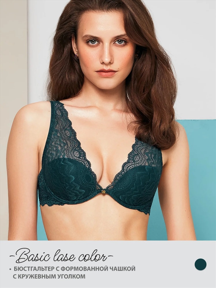 Кружевной бюстгальтер с формованными чашками на косточках, уплотненными в нижней части. С изящной кружевной полосой, которая плавно переходит с чашки на бретель. Позволяет создать оптимальный объем, приподнять грудь и подчеркнуть формы. Удобный стан и регулируемые бретели обеспечивают превосходное облегание и надежную поддержку. Застежка на два крючка создает дополнительный комфорт.