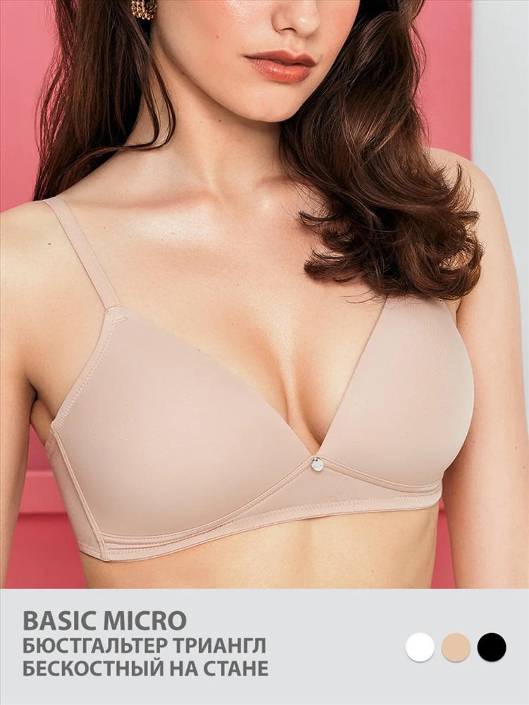 Гладкий бюстгальтер «триангл» из эластичной микрофибры на стане с уплотненными формованными чашками без косточек. Эффектно подчеркивает зону декольте, превосходно облегает и обеспечивает комфортную поддержку благодаря регулируемым бретелям, пластинам в боковых деталях стана и удобной застежке на два крючка.