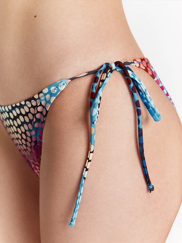 Лиф с эластичными завязками на шее и спине изящно подчеркивает грудь благодаря подвижным треугольным чашкам на кулиске. Формованные уплотненные съемные вкладыши позволяют создать дополнительный объем и эффект идеально округлой груди. Трусы «бикини» на тонких завязках с низкой линией талии открывают бедра и подчеркивают длину ног.