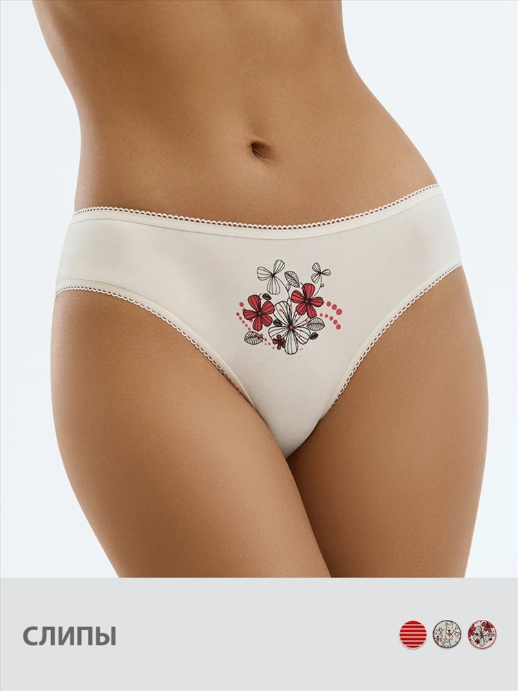 Трусы - слипы со средней линией талии и узкой боковиной. Практически полностью закрывают ягодицы. Выполнены из высокогигиеничного хлопка, который отлично пропускает воздух, впитывает влагу, не подвержен деформации и пилингу, приятно прилегает к телу и подходит даже для самой чувствительной кожи. Края обработаны мягкими эластиками с кружевными фестонами.