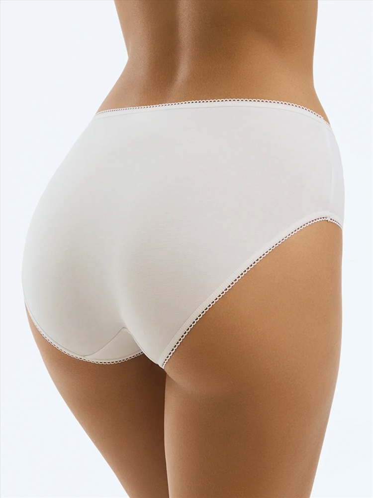 Трусы - слипы со средней линией талии с широкой боковиной. Практически полностью закрывают ягодицы. Изготовлены из высокогигиеничного хлопка, который не подвержен деформации и пилингу, отлично пропускает воздух, впитывает влагу и подходит даже для самой чувствительной кожи. Края обработаны мягкими эластиками с кружевными фестонами.