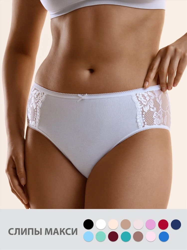 Трусы-слипы Макси выполнены из высокогигиеничного хлопка в сочетании с мягким, эластичным кружевом с цветочным орнаментом, которое деликатно подчеркивает женственность. Максимальный комфорт при носке. Используемый хлопок не подвержен деформации и пилингу. Края изделий обработаны мягкими эластиками с кружевными фестонами.