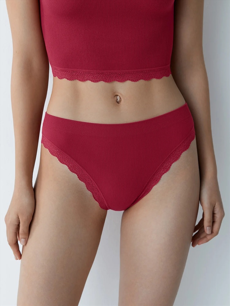 Комфортные трусы-слипы в рубчик со средней линией талии, узкой боковиной и высоким вырезом по бедру. Вырезы по линии бедра обработаны ажурным кружевом с изящным цветочным рисунком.