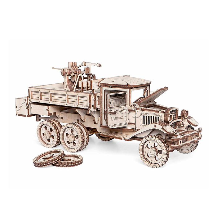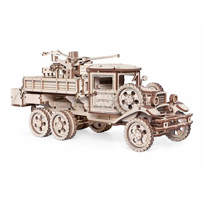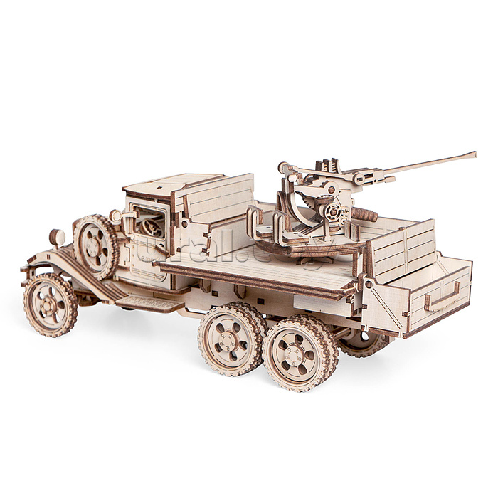 В наборе: - фанера. - наждачная бумага. - клей ПВА. - инструкция. Функции: - подвеска с амортизацией. - открываются двери кабины, капот, борта кузова, крышки ящиков. - вращаются колеса. - поворачивается платформа зенитной пушки. - поднимается и опускается ствол пушки. Размер готового изделия: 25,5х9х11 см. Количество деталей: 287 шт. Соответствует требованиям безопасности продукции. Для детей от 5 лет.
