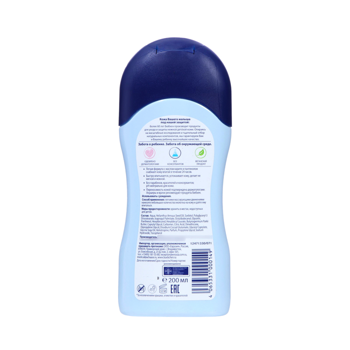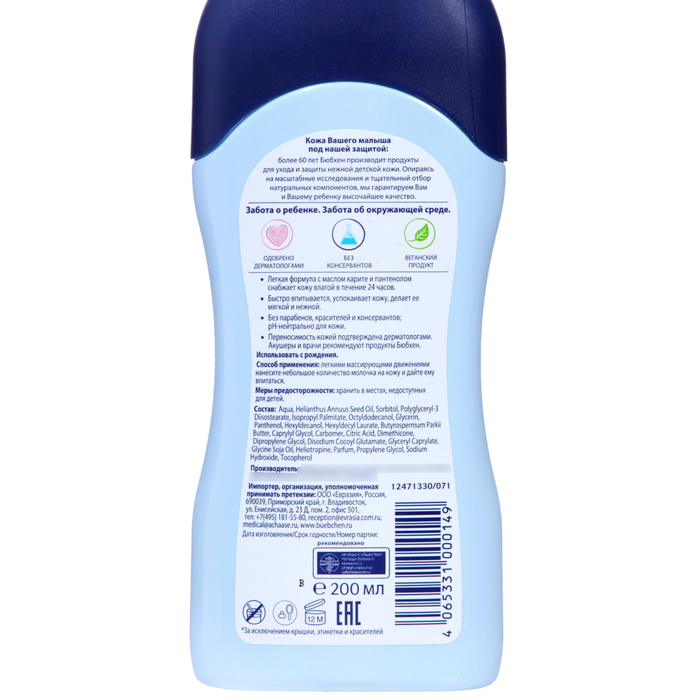 Габариты: 3,5 x 6,5 x 16,5 Страна: Германия В боксе: 8 шт Состав: См. на упаковке Материалы: см. на упаковке Фасовка: по 1 шт Индивидуальная упаковка: Без упаковки Сертификат: ЕАС Объём, мл: 200 Темпер. ограничение НЕ НИЖЕ ℃: 0 Комплекс препятствует избыточной потере влаги через кожу. Молочко сохраняет эластичность и защищает от пересыхания, увлажняет и смягчает кожу. Отлично впитывается кожей и приятно освежает. Масло карите и масло подсолнечника восстанавливают защитный липидный барьер, пантенол способствует заживлению. Использовать с рождения. Комментарии к товару