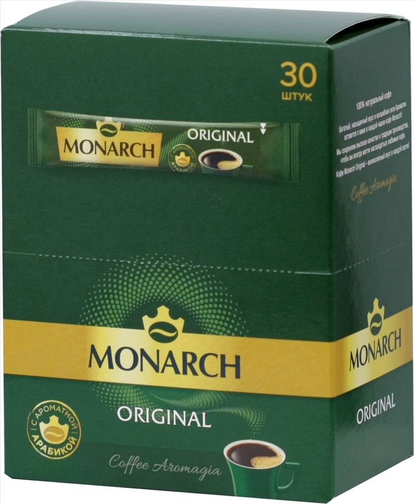 Наличие: >100 Кофе натуральный растворимый сублимированный. Состав: арабика/робуста.Monarch обладает приятным классическим вкусом средней крепости, что достигается благодаря тщательному отбору кофейных зерен и долгой, глубокой обжарке.Обжарка зерен — 4 из 6.