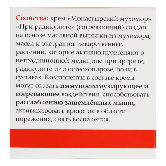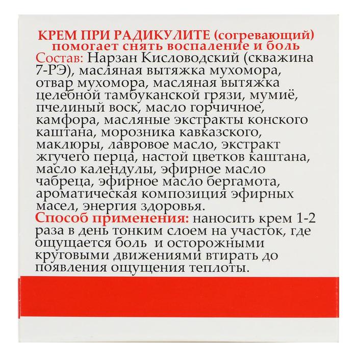 Габариты: 5,5 x 5,5 x 5,5 Страна: Россия В боксе: 63 шт Состав: См. на упаковке Материалы: см. на упаковке Фасовка: по 1 шт Индивидуальная упаковка: Картонная коробка / упаковка Сертификат: ЕАС Вес, г/Объём, мл: 50 Назначение: Разогревающие и охлаждающие Темпер. ограничение НЕ НИЖЕ ℃: 0 Фиксированная цена: Да Свойства Крем изготовлен на основе масляной вытяжки из мухомора, которую активно применяют в народной медицине. Средство эффективно при артрите, радикулите или остеохондрозе. Обладает согревающим эффектом, защемленные мышцы начинают расслабляться, активизируется кровоток в области поражения, снимается воспаление. Отвар мухомора обладает иммуностимулирующим эффектом и считается хорошим средством при болях в суставах и радикулите. Способ применения Крем наносить тонким слоем на участок, который вызывает боль и осторожными, круговыми движениями втирать, до ощущения тепла, 1 или 2 раза в день. Состав: нарзан кисловодский (скважина 7-РЭ), масляная вытяжка мухомора, отвар мухомора, масляная вытяжка целебной тамбуканской грязи, мумиё, белый воск, масло горчичное, камфора, масляные экстракты конского каштана, морозника кавказского, маклюры, лавровое масло, экстракт жгучего перца, настой цветков каштана, масло календулы, эфирное масло чабреца, эфирное масло бергамота. Комментарии к товару