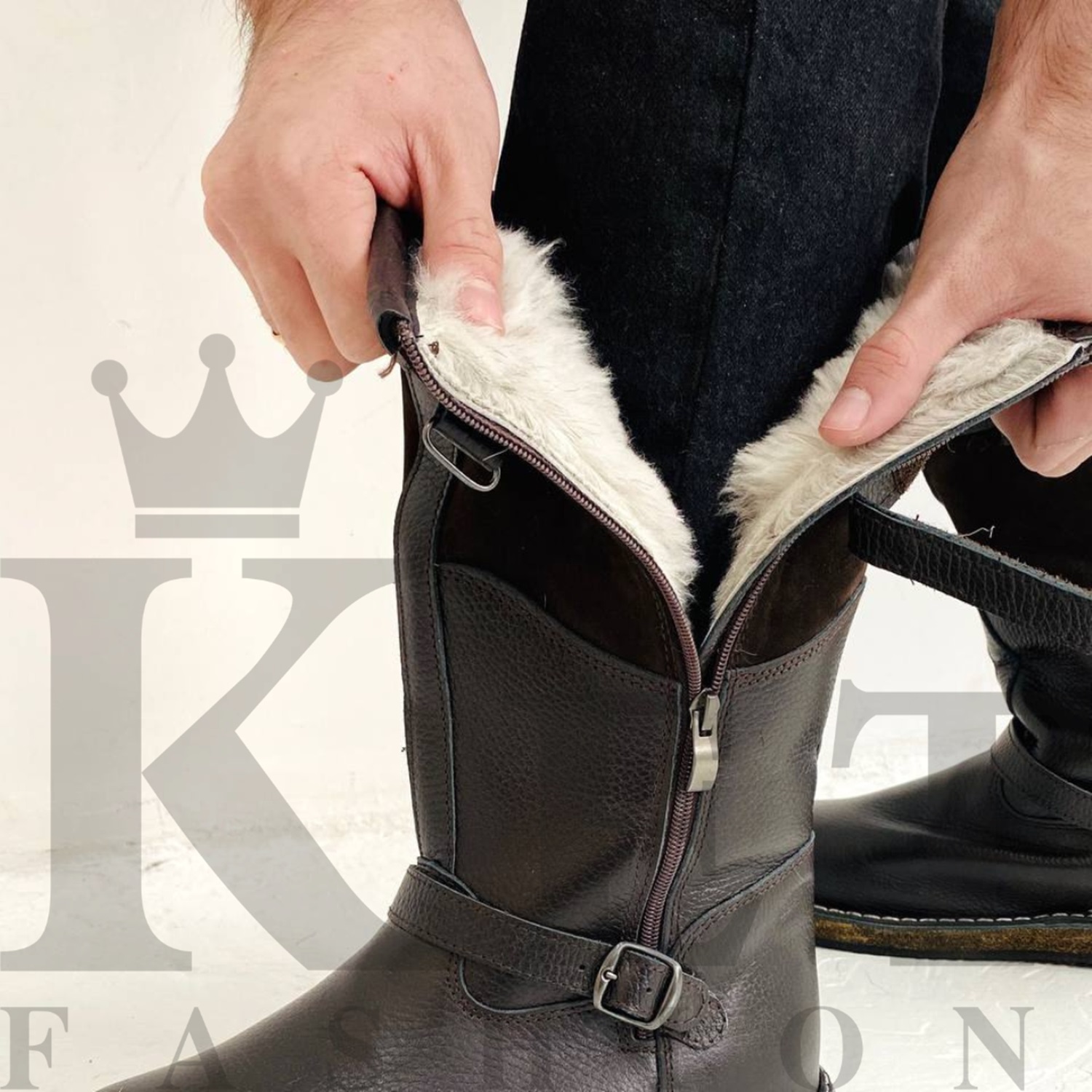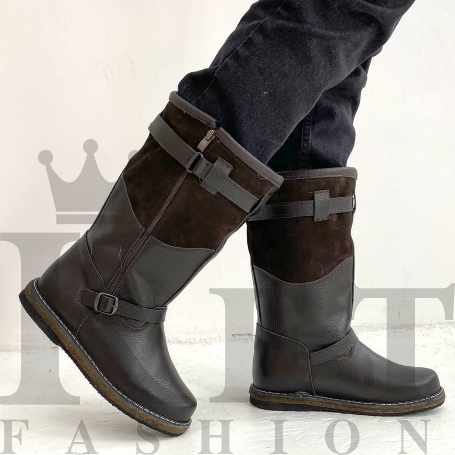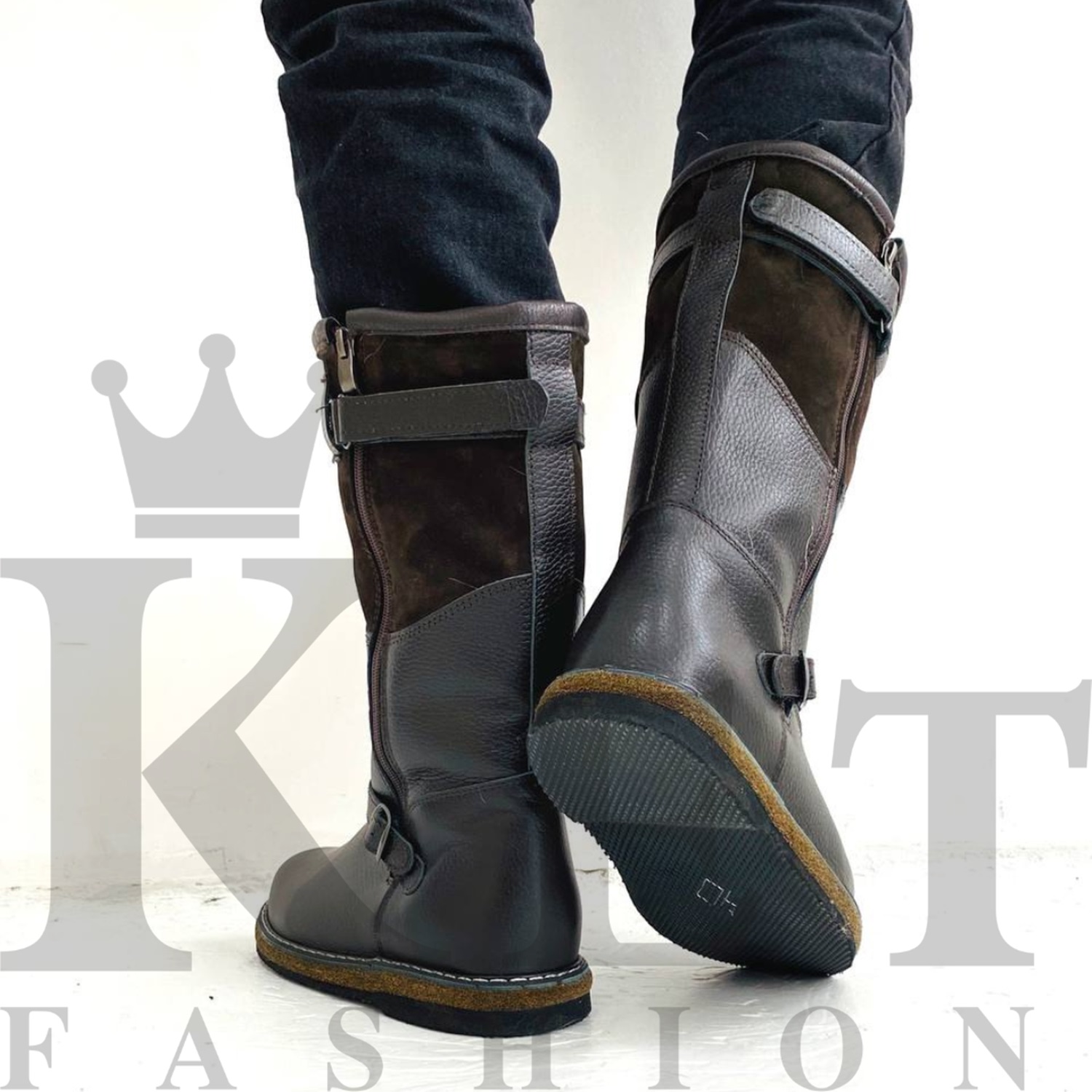 Наружняя сторона голенища – натуральная кожа Внутренняя часть – натуральная овчина Союзка – натуральная кожа Размеры: с 40 по 46 Виды подошвы: войлочная подошва Наличии молнии: есть Высота: ~34см. Страна производитель: Россия