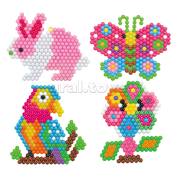 В набор входит: - бокс для бусин. - пластиковая основа 2 шт. - цветные бусины 1000 шт (10 цветов). - распылитель для воды 1 шт. - пинцет 1 шт. - ручка для бусин. - подвес. - кольцо 8 шт. Материал: полимерные материалы, картон. Соответствует требованиям безопасности продукции. Для детей от 5 лет