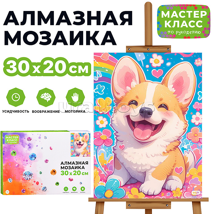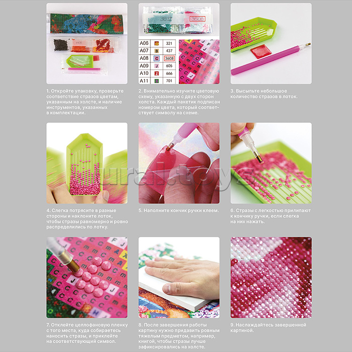 В наборе: - холст на подрамнике со схемой 20 х 30 см. - стразы. - емкость для стразов. - ручка для стразов. - гель-клей. Соответствует требованиям безопасности продукции. Для детей от 12 лет.