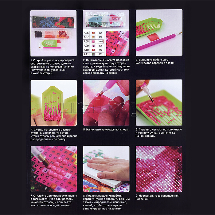 Код: 499506 Штрихкод: 6978459076355 Страна производитель: Китай Размеры упаковки: 51 x 41 x 2.5 см Количество в коробке: 30 В наборе: - холст на деревянном подрамнике, со схемой (50 х 40 см.) - стразы. - ёмкость для страз. - ручка для страз. - гель-клей. Тип сборки: полная выкладка. Соответствует требованиям безопасности продукции. Для детей от 12 лет. Комментарии к товару