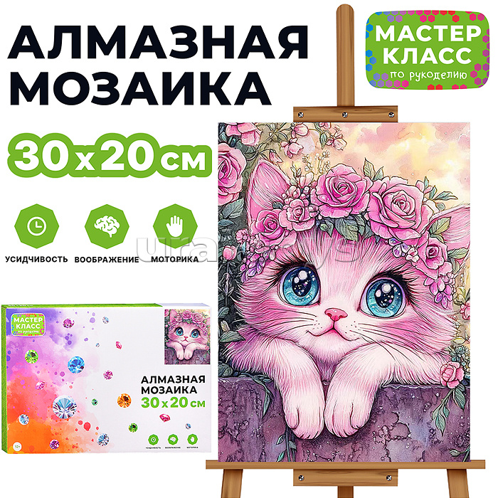 В наборе: - холст на подрамнике со схемой 20 х 30 см. - стразы. - емкость для стразов. - ручка для стразов. - гель-клей. Соответствует требованиям безопасности продукции. Для детей от 12 лет.