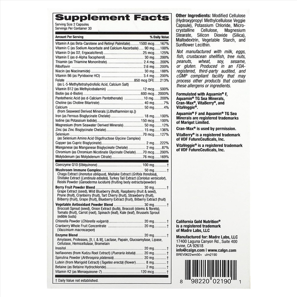 Протестировано сторонней организацией Рекомендации по применениюПринимать по 2 капсулы в день во время еды. Рекомендуется принимать в соответствии с назначением квалифицированного медицинского работника. ИнгредиентыДругие ингредиенты Содержит морские минералы Aquamin® F, Aquamin® TG, Cran-Max®, VitaBerry®, VitaVeggie®. Морские минералы Aquamin® F и Aquamin® TG — это зарегистрированные торговые марки Marigot Limited. Cran-Max® используется с разрешения. VitaBerry® — зарегистрированная торговая марка VDF FutureCeuticals, Inc. VitaVeggie® — зарегистрированная торговая марка VDF FutureCeuticals, Inc. При производстве не используются молоко, яйца, рыба, моллюски и ракообразные, древесные орехи, арахис, пшеница, соя, кунжут, глютен. Производится на предприятии, имеющем регистрацию FDA, которое проходит независимые проверки, имеет регистрацию текущей надлежащей производственной практики (cGMP), где также могут обрабатываться другие продукты, содержащие эти аллергены или ингредиенты. ПредупрежденияХранить в недоступном для детей месте. Перед началом применения пищевых добавок беременные и кормящие женщины, хронические больные, люди преклонного возраста, лица младше 18 лет, лица, принимающие рецептурные препараты (например, антикоагулянты) или имеющие диагностированное врачом заболевание, должны проконсультироваться с врачом, фармацевтом, натуропатом или другим квалифицированным медицинским работником. Продукт герметично упакован в целях безопасности. Не используйте, если индивидуальные блистеры проколоты или повреждены. Хранить в сухом и прохладном месте. Беречь от воздействия тепла, света и влаги. ПРЕДУПРЕЖДЕНИЕ. Случайная передозировка продуктов, содержащих железо, — основная причина отравлений со смертельным исходом среди детей до 6 лет. Хранить продукт в недоступном для детей месте. В случае передозировки следует немедленно обратиться к врачу или в токсикологический центр. Отказ от ответственностиКомпания iHerb всегда стремится придерживаться максимальной точности в изображениях и информации о своей продукции. Однако некоторые изменения, вносимые производителями, касающиеся упаковки или списка ингредиентов, могут потребовать определенного времени до того момента, как они будут опубликованы на сайте. Имейте в виду, что даже несмотря на то, что иногда упаковка товаров может изменяться, это никак не влияет на качество и свежесть продуктов. Мы рекомендуем вам внимательно ознакомиться с данными на упаковке, предупреждениями и инструкциями по использованию продуктов перед их применением и не полагаться исключительно на информацию, представленную на сайте iHerb. Обратите внимание, что некоторые из описаний продуктов на нашем сайте выполнены с использованием машинного перевода. Это сделано исключительно для вашего удобства. Все подобные переводы будут заменены на выполненные нашими лингвистами в самое ближайшее время. Комментарии к товару