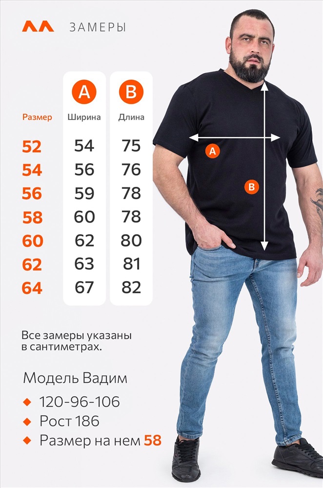 Рост модели 186 см, параметры: объем груди 120, объем талии 96, объем бедер 106. На нём размер 58.