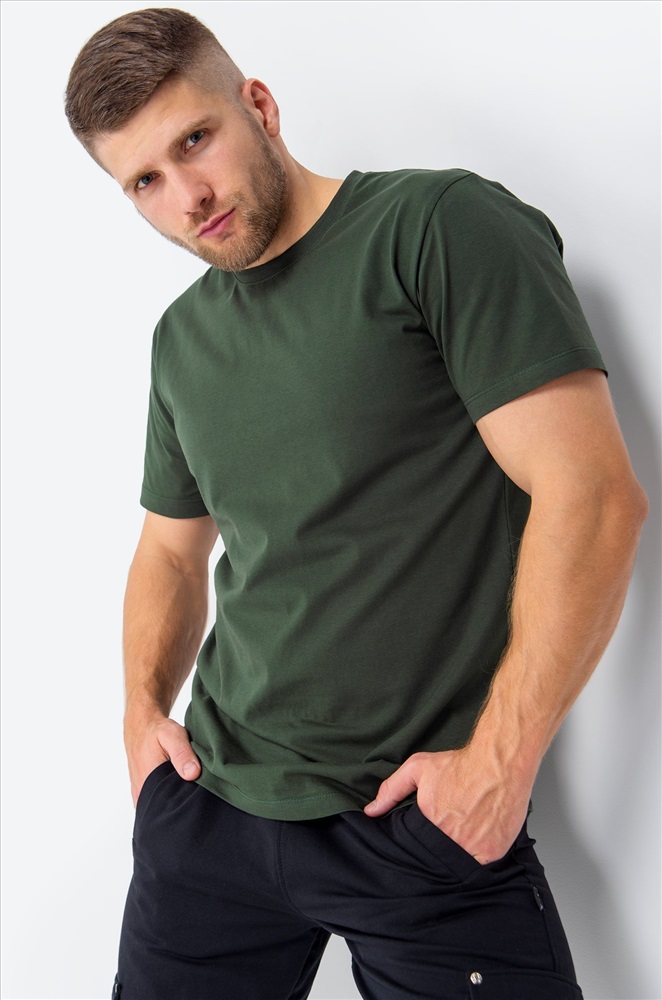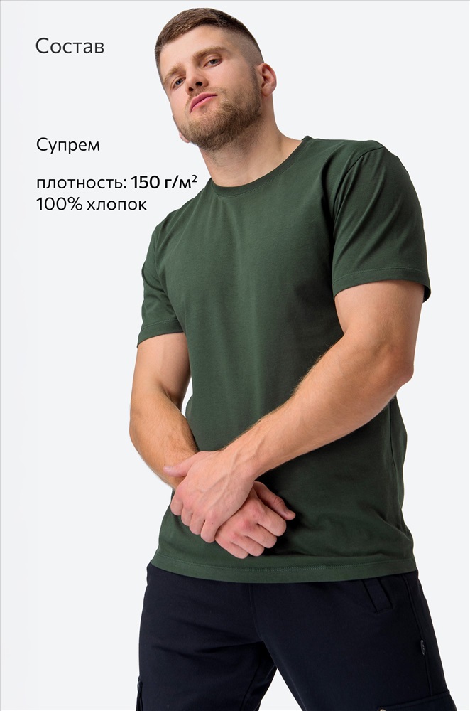 Однотонная футболка оттенка хаки – тот случай, когда не нужно придумывать, что надеть. Мужская футболка идеальна для создания стильных повседневных образов. Классическая модель с коротким рукавом выполнена из натурального 100% хлопка.