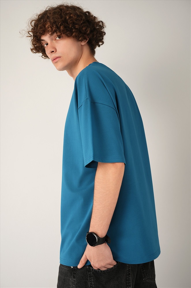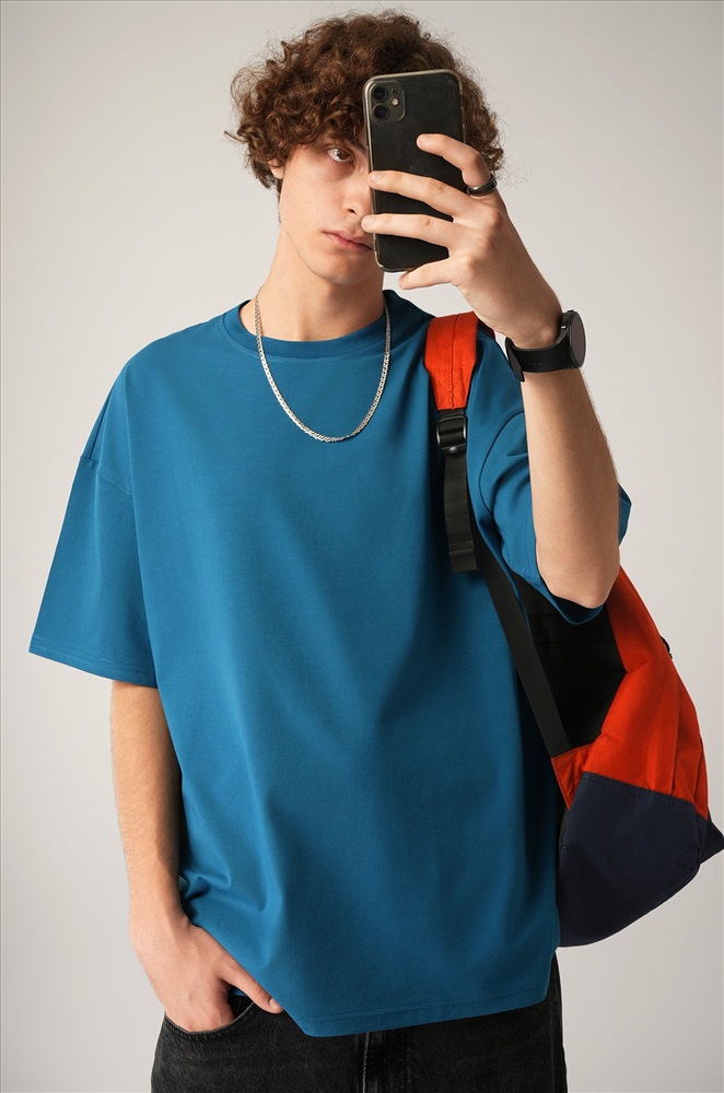 Мужская базовая футболка оверсайз станет отличной основой для образов в уличном стиле. Плотная хлопковая футболка оттенка морской волны — прекрасное решение для активного отдыха.