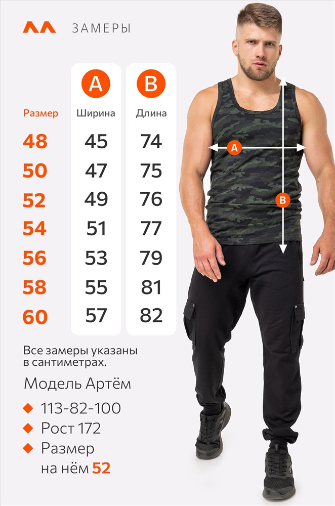 Натуральный хлопковый трикотаж хорошо пропускает воздух и отводит влагу, что очень важно во время бега и активных занятий. Дышащая ткань супрем очень приятна телу, принт не теряет своей насыщенности. Камуфляжная майка станет лучшим дополнением экипировки рыбака, охотника и туриста. Тактическая нательная майка борцовка создана для полного комфорта даже в экстремальных ситуациях на охоте, рыбалке или в турпоходе. Бельевая майка гармонично вписывается в спортивный стиль и пригодится мужчинам во время занятий спортом, а также дома и летом на даче. Широкий размерный ряд, есть большие размеры. Внимание: майка облегающего силуэта мало тянется за счет плотной ткани. Если вы любите посвободнее, рекомендуем покупать на размер больше. Модель Артем, его рост 172 см, параметры 113-82-100 см. На нем размер 52.