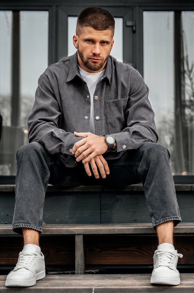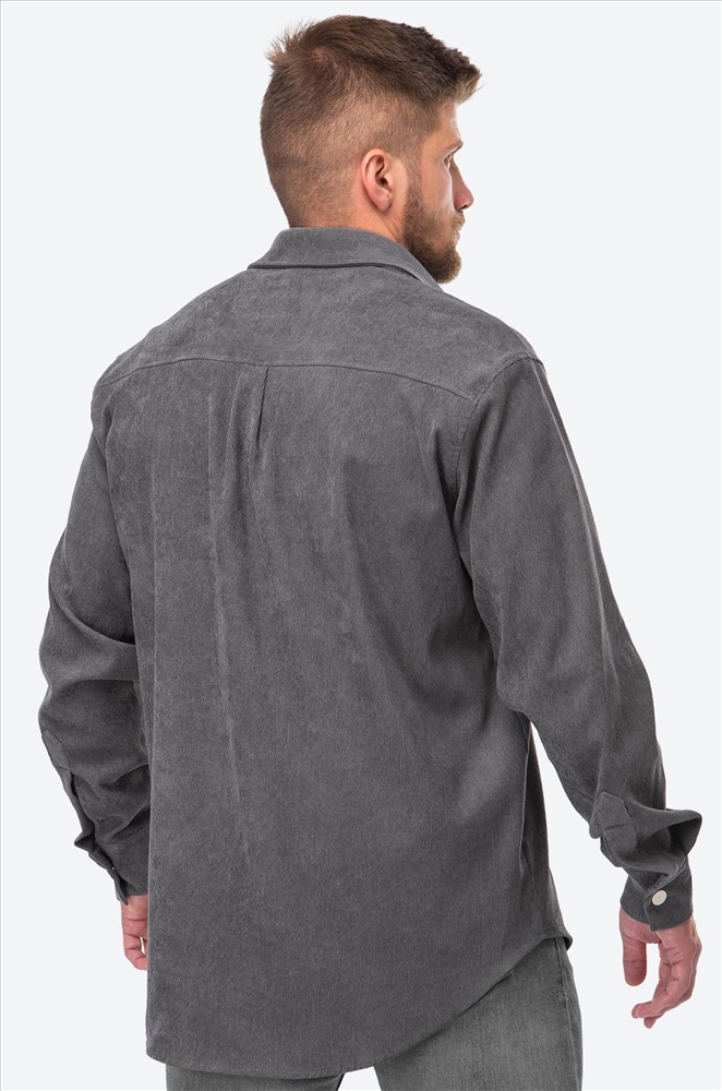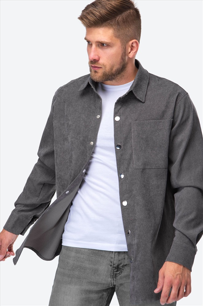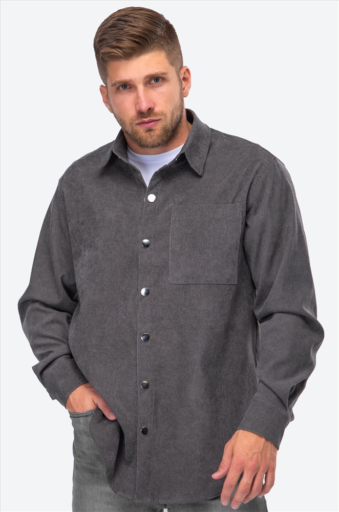 Мужская темно-серая рубашка из мягкого вельвета – отличный способ подчеркнуть свою индивидуальность. Свободный крой подарит уют и комфорт, а карман на груди и застежка на металлические кнопки добавят стильную изюминку в образ. Однотонная вельветовая рубашка с удлиненной спинкой идеальна для прохладной весны и зябкой осени.