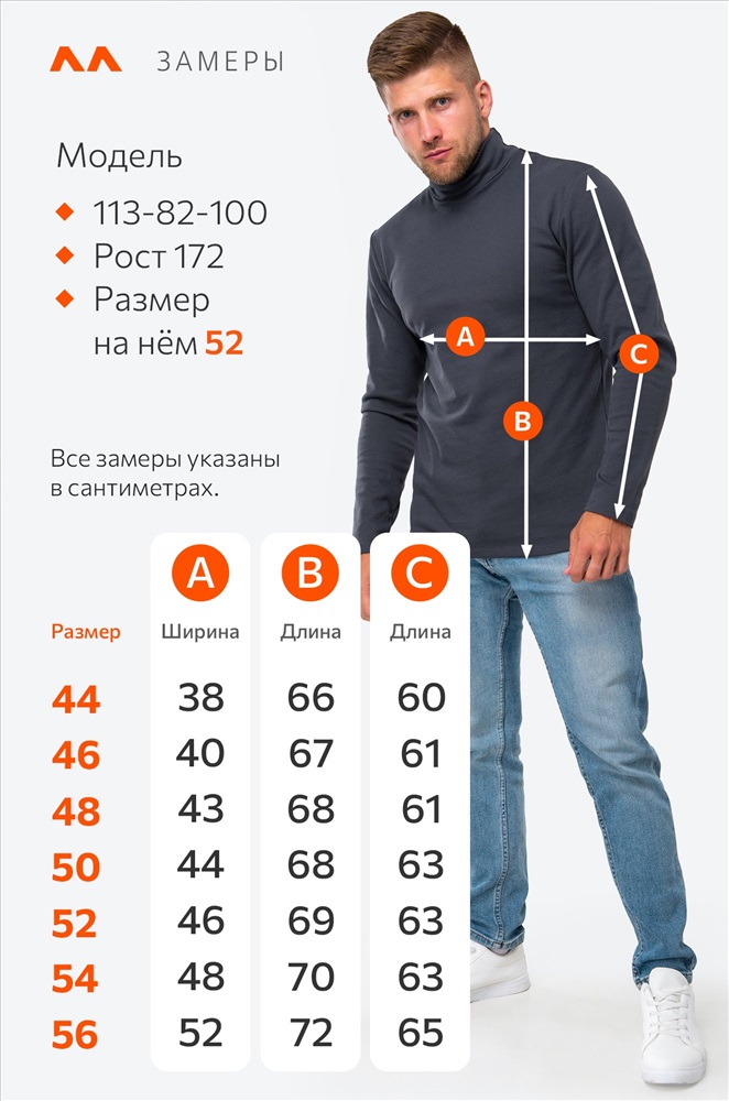 Базовая водолазка темно-серого цвета из мягкого и приятного к телу хлопка для мужчин – сочетание стиля и комфорта на каждый день. Высокий ворот, длинные рукава и насыщенный цвет – главные составляющие идеальной мужской модели для этой осени. Облегающий крой добавляет образу харизмы, не сковывая движений и сохраняя привычный ритм жизни парня. Демисезонный лонгслив выполнен из нежной и легкой трикотажной ткани рибана, которая хорошо сохраняет тепло и делает его идеальным для прохладной осенней и весенней погоды. Благодаря лайкре в составе хлопковый джемпер отлично тянется и повторяет каждое движение тела. Ткань выдерживает многочисленные стирки и надолго сохраняет первоначальный внешний вид. Высокий воротник-стойка нежно прилегает к шее, длинные рукава защищают от ветра, а плоские анатомические швы не ощущаются в течение дня. Удлиненный силуэт и облегающий крой делают свитер стильным и акцентным. Однотонная водолазка поможет создать образ в любом стиле: классическом – деловой лук для работы в офисе и учебы, или образ в стиле smart casual (смарт кэжуал). Водолазка после стирки может давать усадку, при выборе размера просим обратить на это внимание. Модель Артем, его рост 172 см, параметры 113-82-100. На нем размер 52. Размер 44: длина:66 см; ширина:38 см; длина рукава внешняя:60 см; длина рукава внутренняя:48 см. Размер 46: длина:67 см; ширина:40 см; длина рукава внешняя:61 см; длина рукава внутренняя:50 см. Размер 48: длина:69 см; ширина:44 см; длина рукава внешняя:61 см; длина рукава внутренняя:50 см. Размер 50: длина:70 см; ширина:44 см; длина рукава внешняя:61 см; длина рукава внутренняя:50 см. Размер 52: длина:71 см; ширина:48 см; длина рукава внешняя:62 см; длина рукава внутренняя:51 см. Размер 54: длина:72 см; ширина:48 см; длина рукава внешняя:62 см; длина рукава внутренняя:51 см. Размер 56: длина:73 см; ширина:52 см; длина рукава внешняя:63 см; длина рукава внутренняя:52 см. *замеры выборочные, могут незначительно отличаться. Комментарии к товару