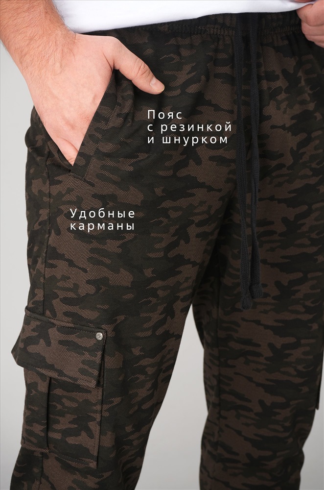 Преимущества: — демисезонные брюки комфортны благодаря мягкому хлопковому трикотажу (плотность 220 г/м2); — манжеты не дают спортивкам задираться; — эластичный пояс на резинке со шнурком обеспечивает удобную посадку; — дополнительно предусмотрены удобные карманы карго для необходимых мелочей; — принт камуфляж флора лес не боится стирок, надолго сохраняет первоначальный вид и яркость. Спортивные брюки для мужчин станут отличным выбором на каждый день.