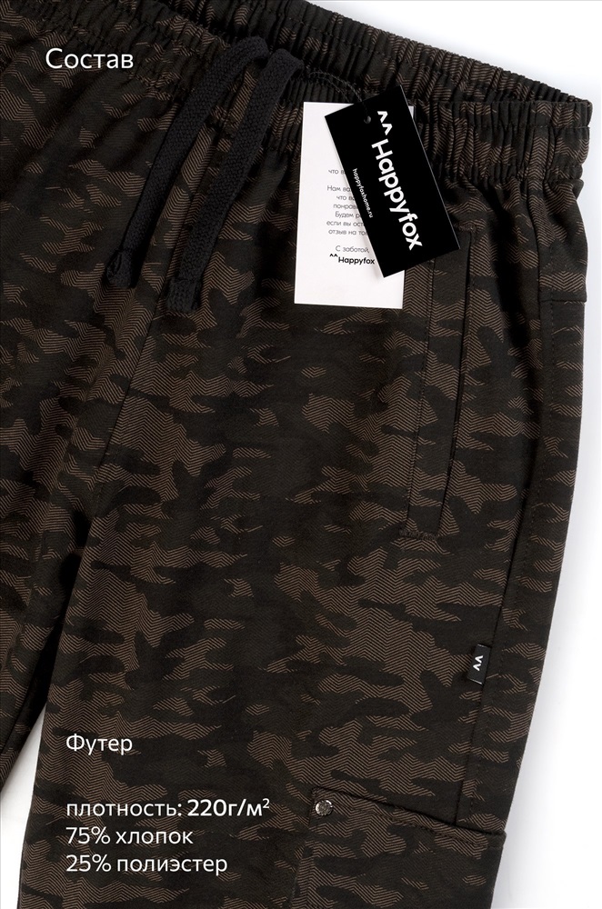 Бренд: Happyfox Серия: Happyfox- Камуфляж Страна: Узбекистан Состав: хлопок 75%, полиэстер 25% Материал: Футер двухнитка Плотность ткани: 220 г/м2 Цвет: флора.лес.хаки