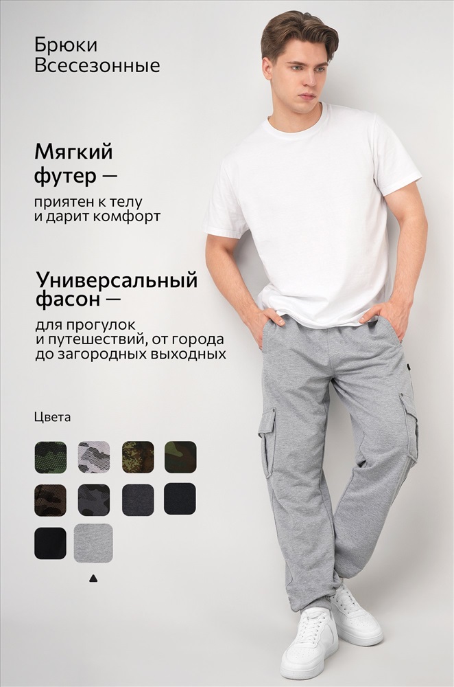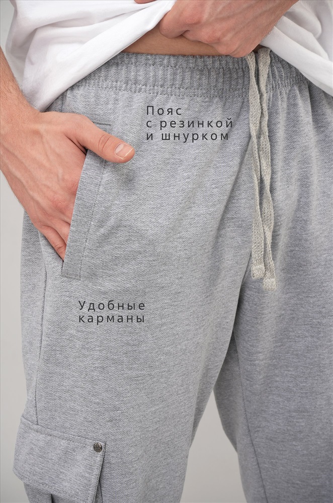 Преимущества: — комфортны благодаря мягкому хлопковому трикотажу (плотность 220 г/м2); — эластичные манжеты не дают спортивкам задираться; — дополнительно предусмотрены удобные карманы карго для необходимых мелочей; — универсальный серый цвет, который легко сочетать различным верхом. Спортивные брюки созданы для мужчин, ценящих комфорт, и станут отличным выбором для спорта и на каждый день.