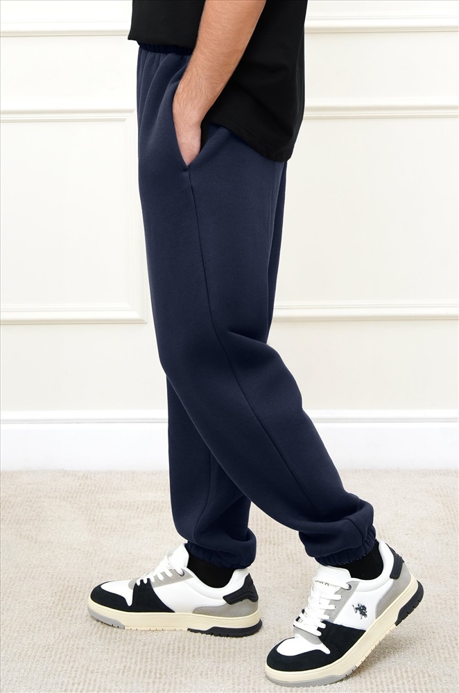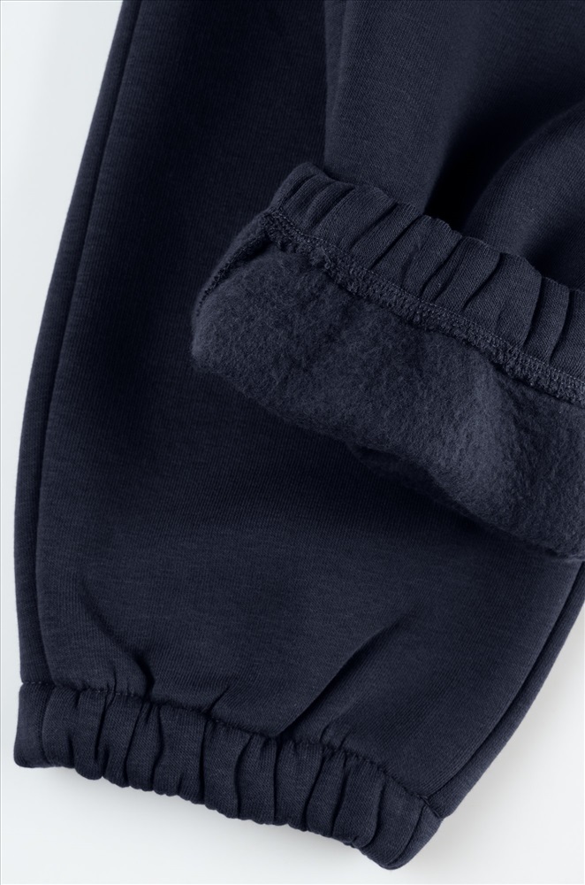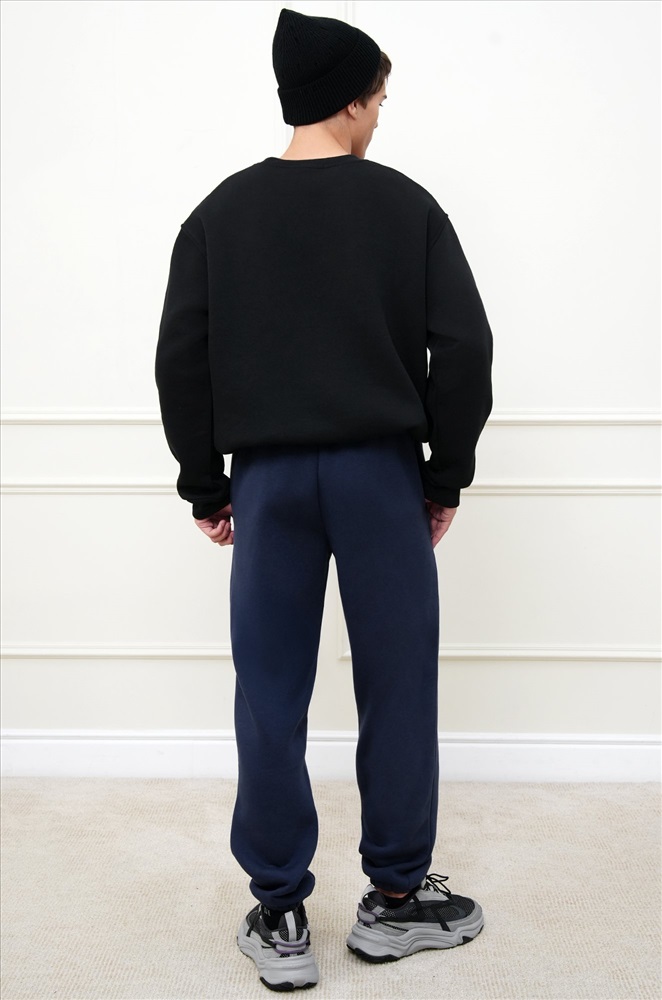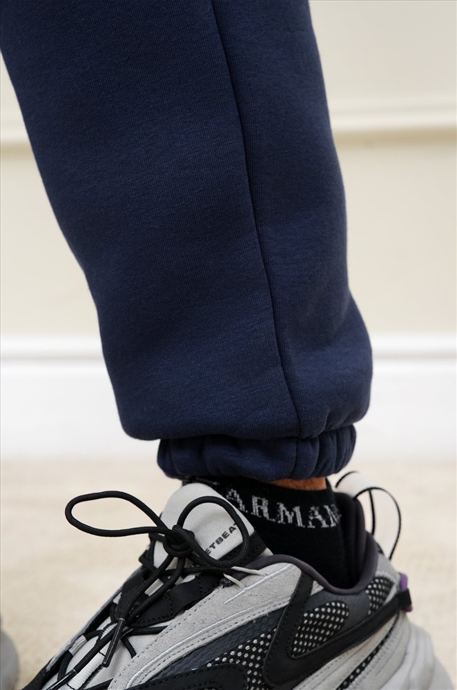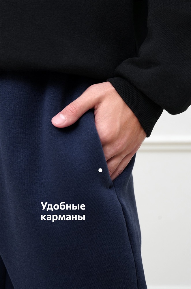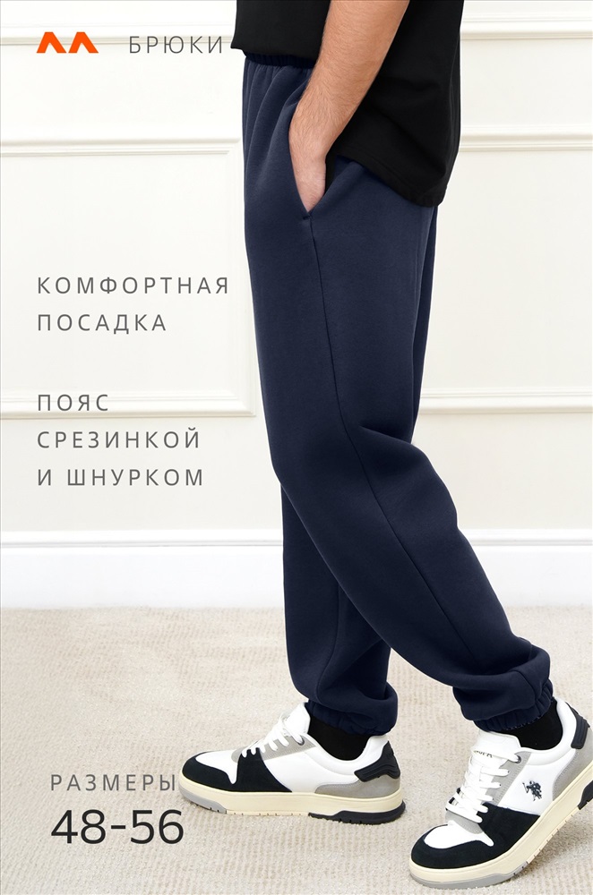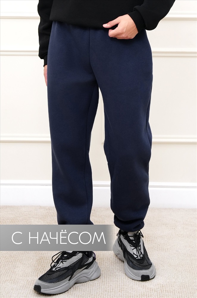Теплые мужские брюки джоггеры выполнены из трикотажа футер с начёсом. Однотонные штаны в темно-синем цвете подойдут для спорта на улице, активного отдыха и повседневных прогулок.