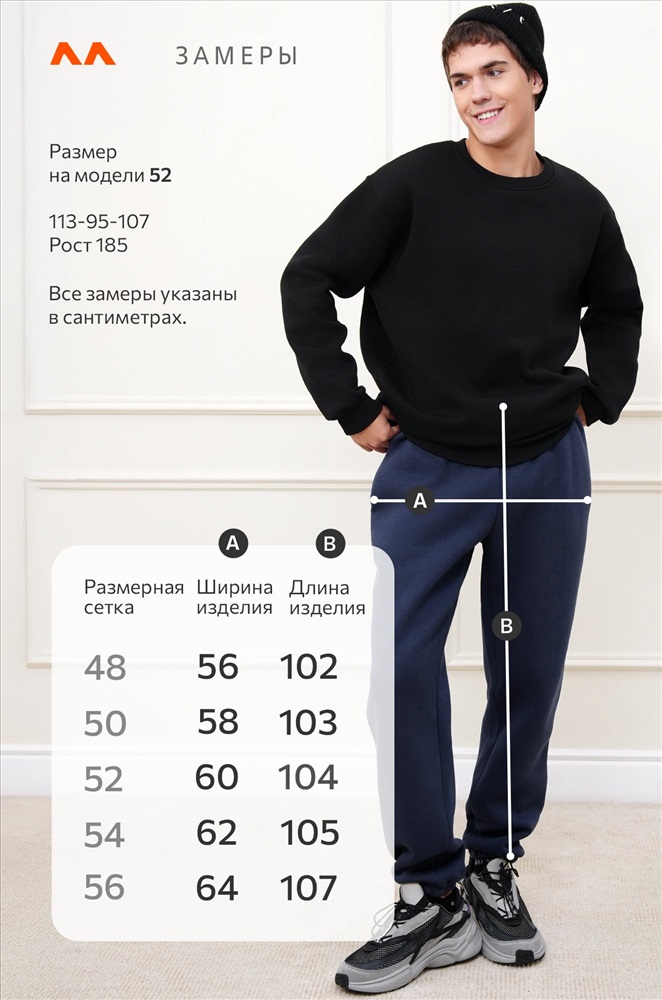 Размер 56: длина внеш. шва: 107 см; длина внут. шва: 78 см; ширина по бедрам: 64 см.