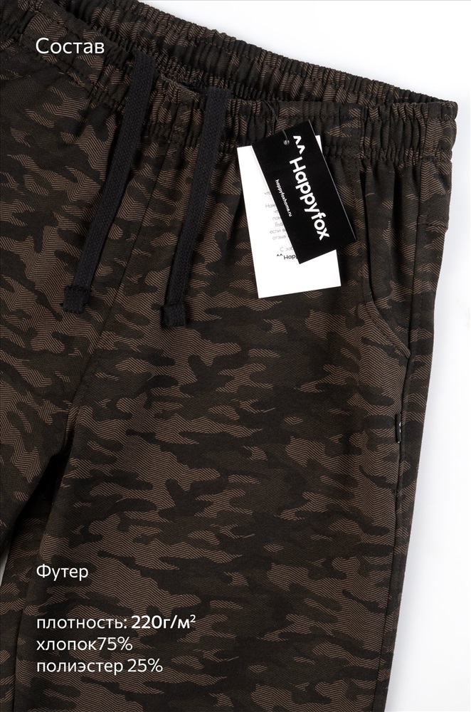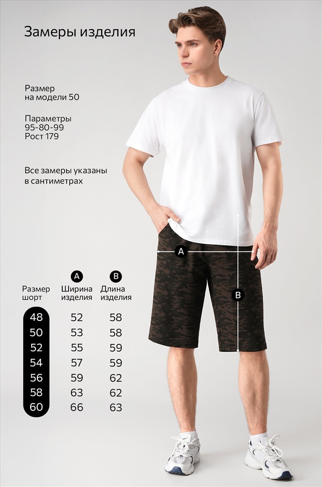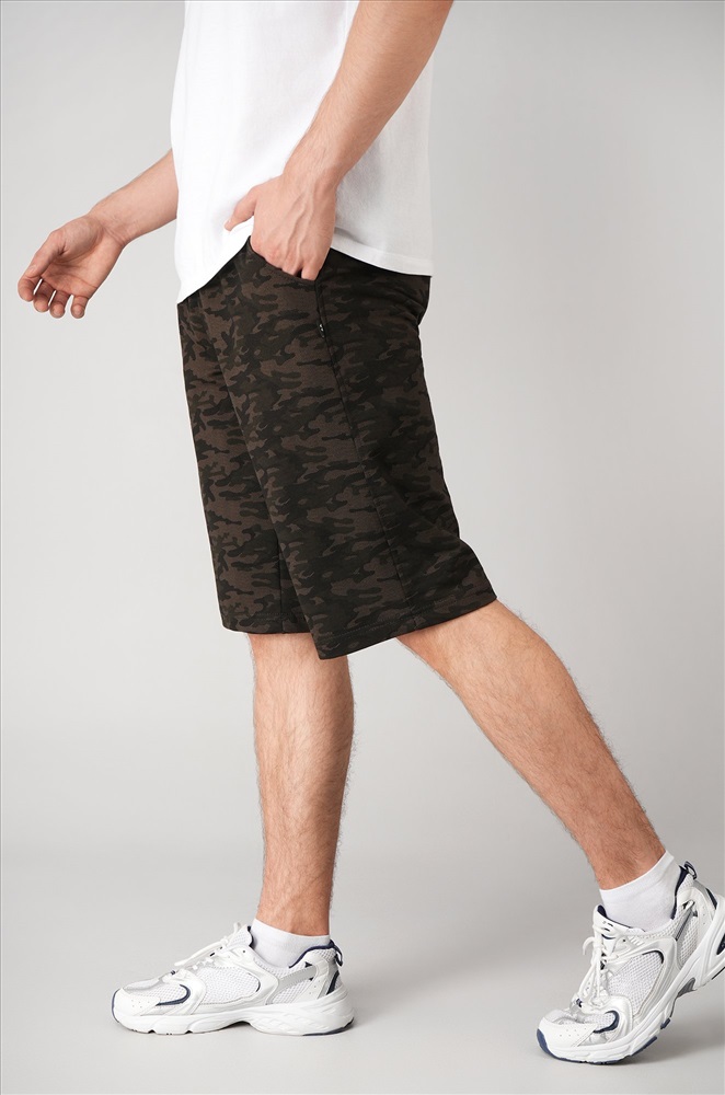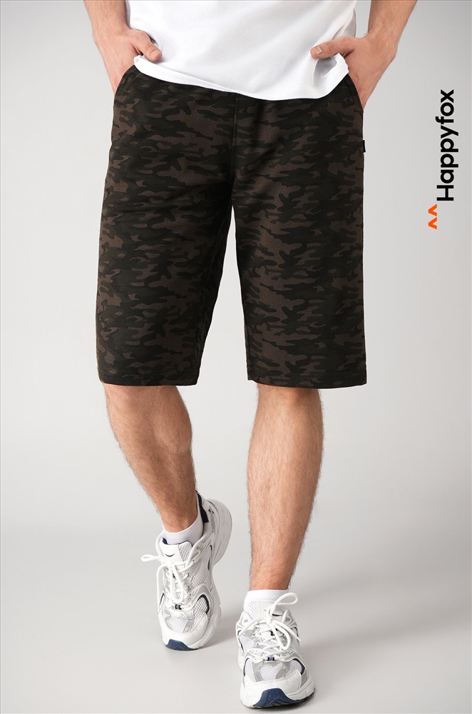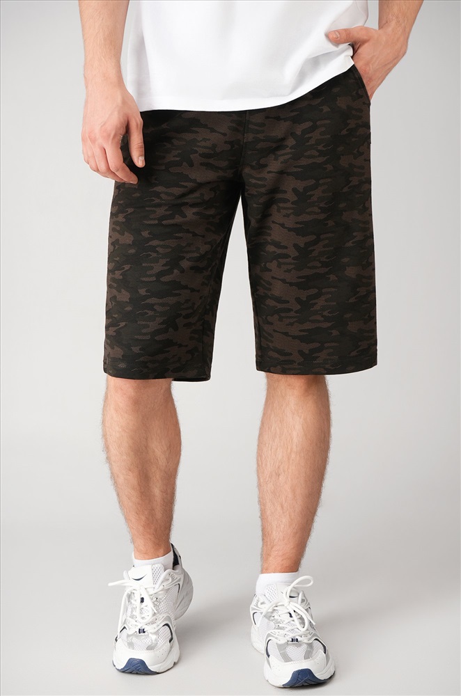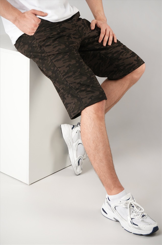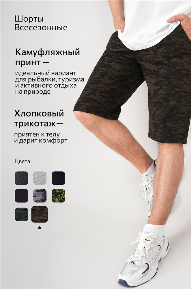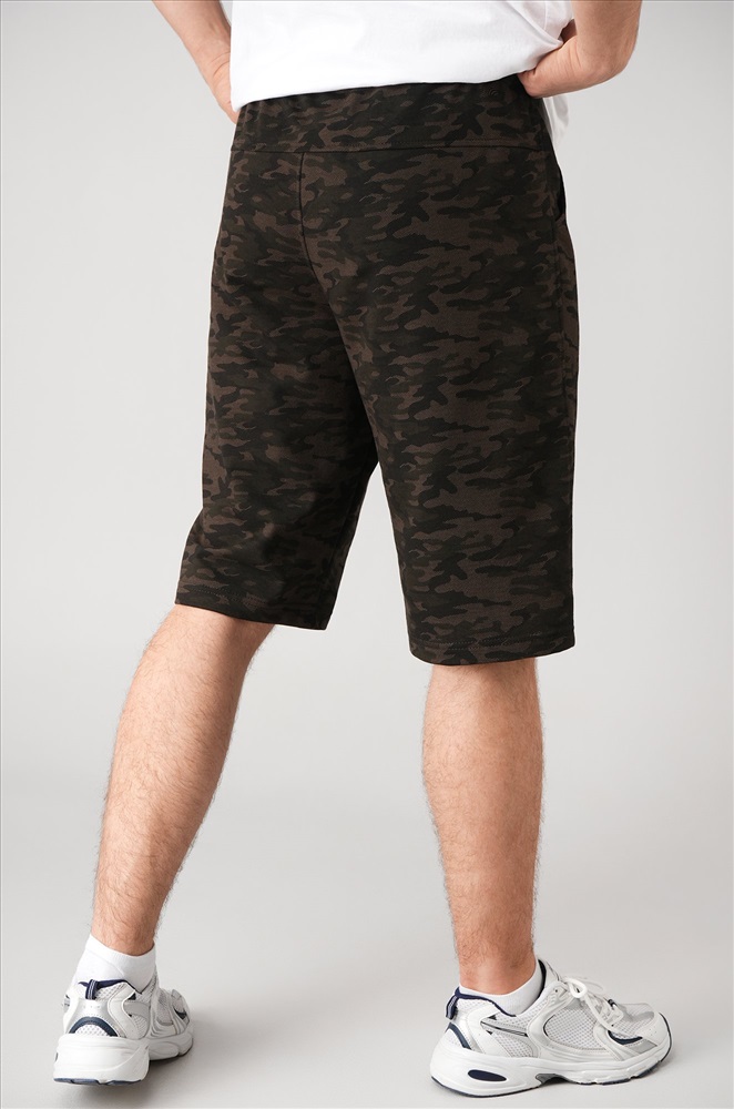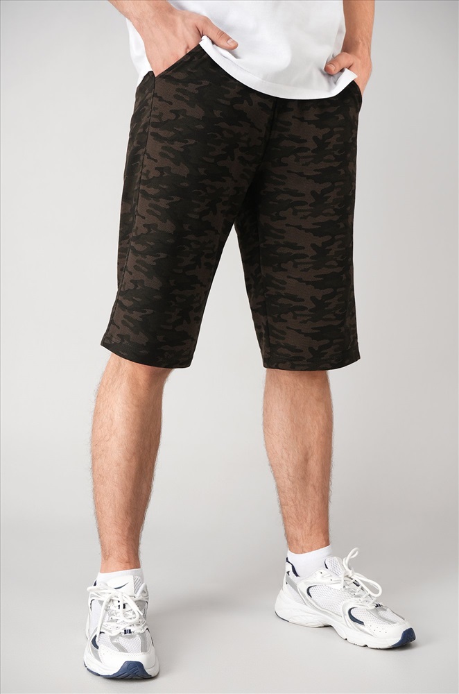Мужские шорты с камуфляжным принтом цвета хаки — ваш универсальный вариант на каждый день! Удлиненная модель прямого кроя с эластичным поясом выглядит стильно и обеспечивает полный комфорт. Плотный, приятный к телу хлопковый трикотаж делает их идеальным выбором для любой активности.