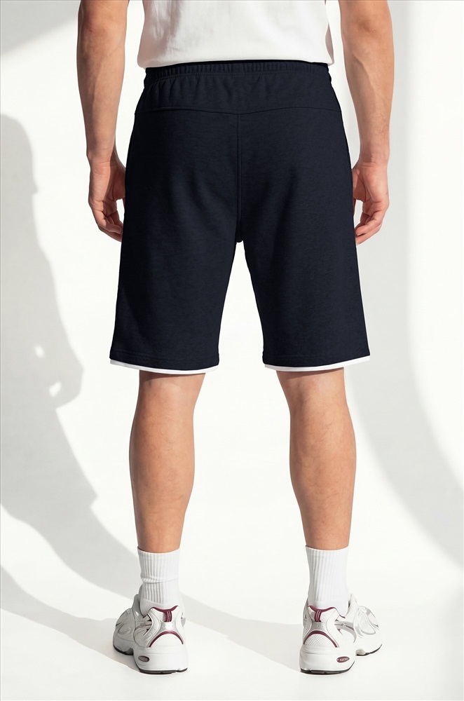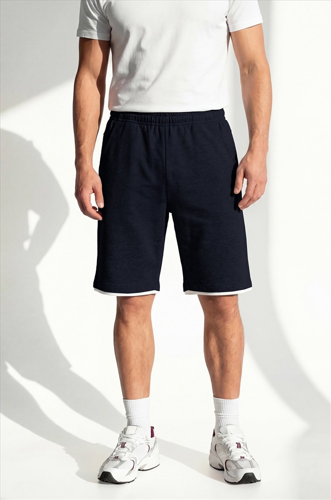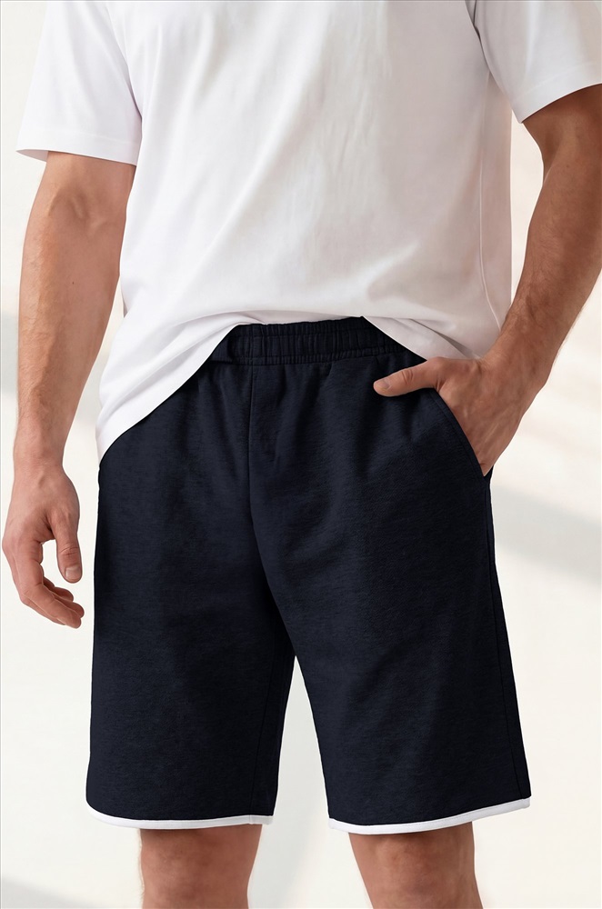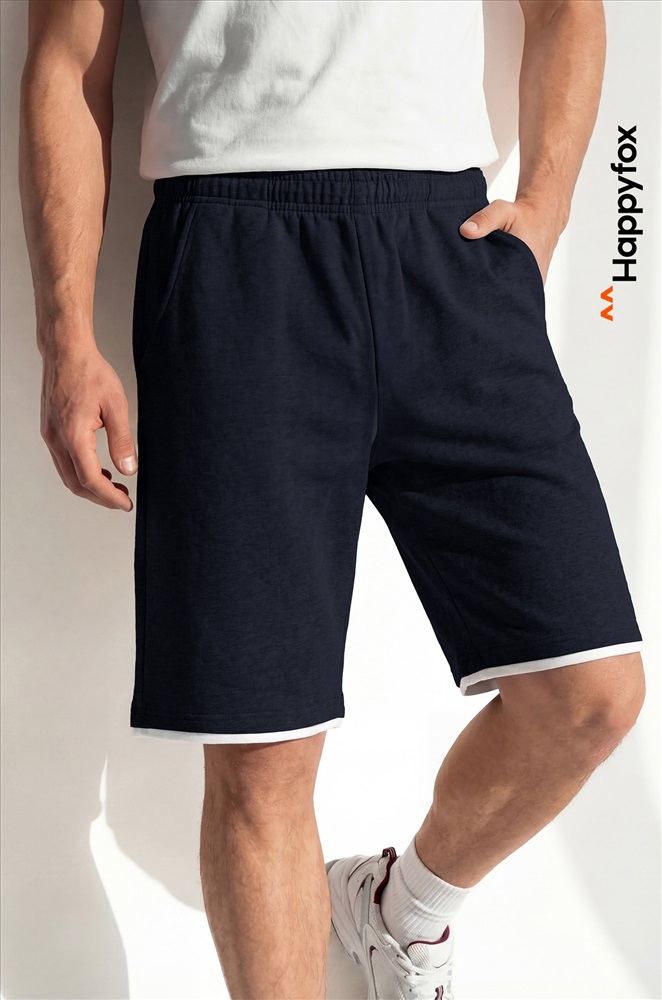 Мужские шорты синего цвета — ваш универсальный вариант на каждый день! Удлиненная модель прямого кроя декорирована по низу белой полосой и выглядит аккуратно и стильно. Плотный, приятный к телу хлопковый трикотаж делает их идеальным выбором для любой активности.