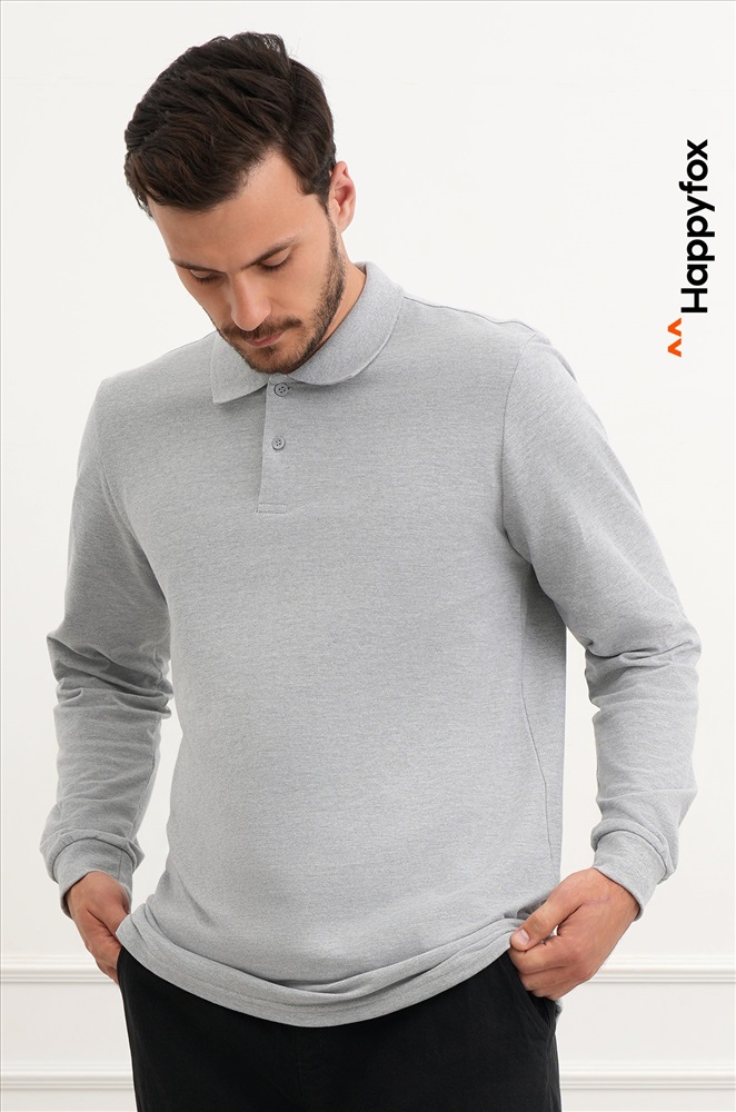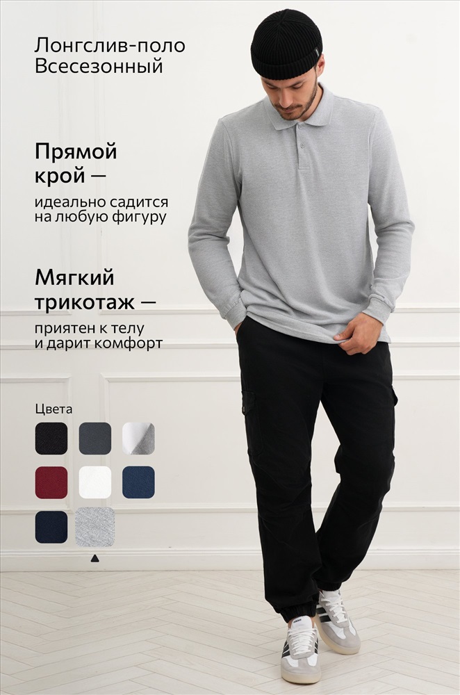 Светло-серый лонгслив поло — лаконичный фаворит мужского гардероба, который всегда к месту. Идеальный баланс между комфортом и стильным минимализмом для повседневных образов.