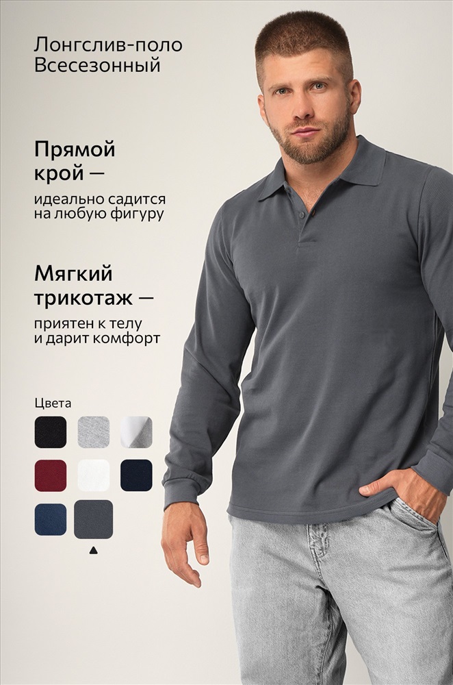 Мужской лонгслив поло из 100% хлопка — универсальный вариант для офиса и активного отдыха. Базовое темно-серое поло для мужчин поможет создать брутальный кэжуал образ благодаря стильному сочетанию деталей.
