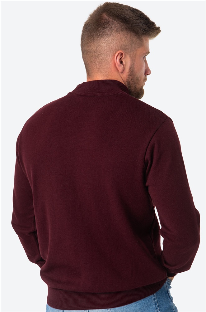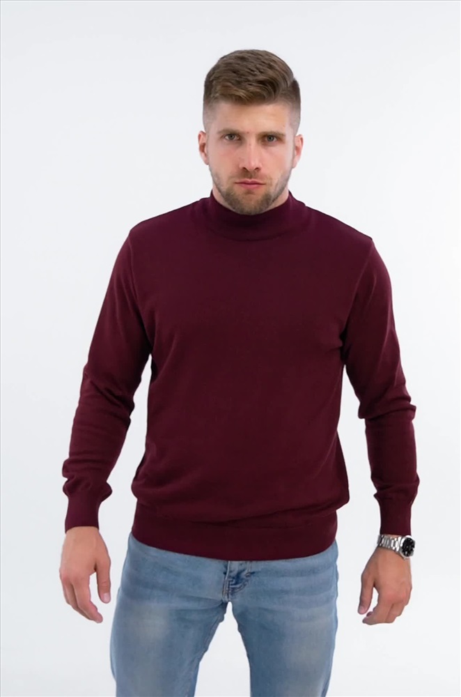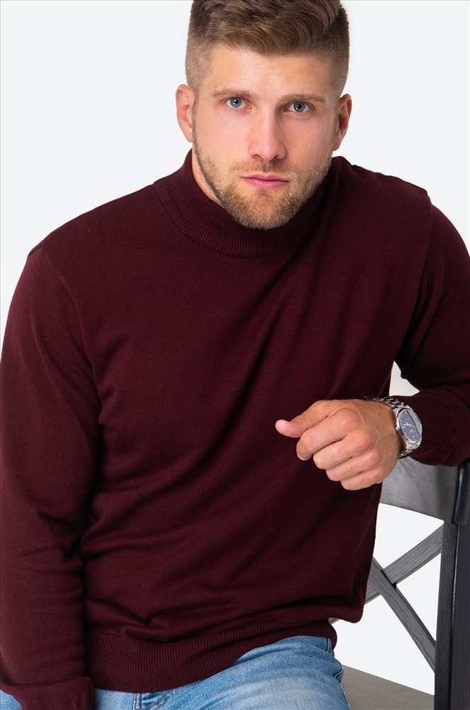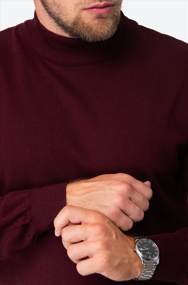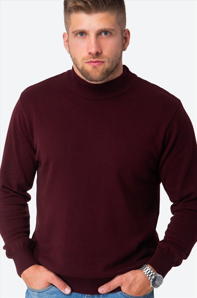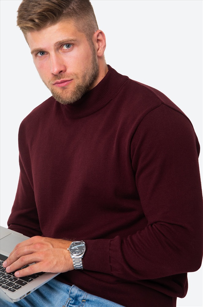 Бордовый джемпер с воротником-стойкой для мужчин выполнен из вязаного трикотажа: в нём будет уютно и тепло в прохладную погоду. Красная водолазка из мягкой хлопковой пряжи с акрилом невероятно приятный к телу. Короткий воротник не пережимает горло и отлично держит форму.