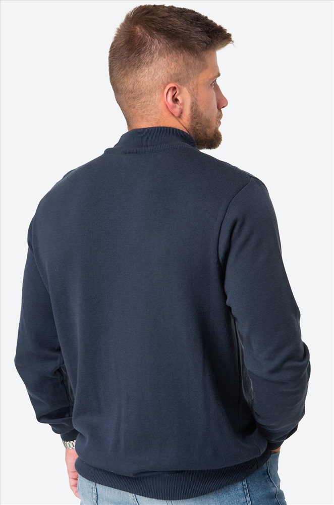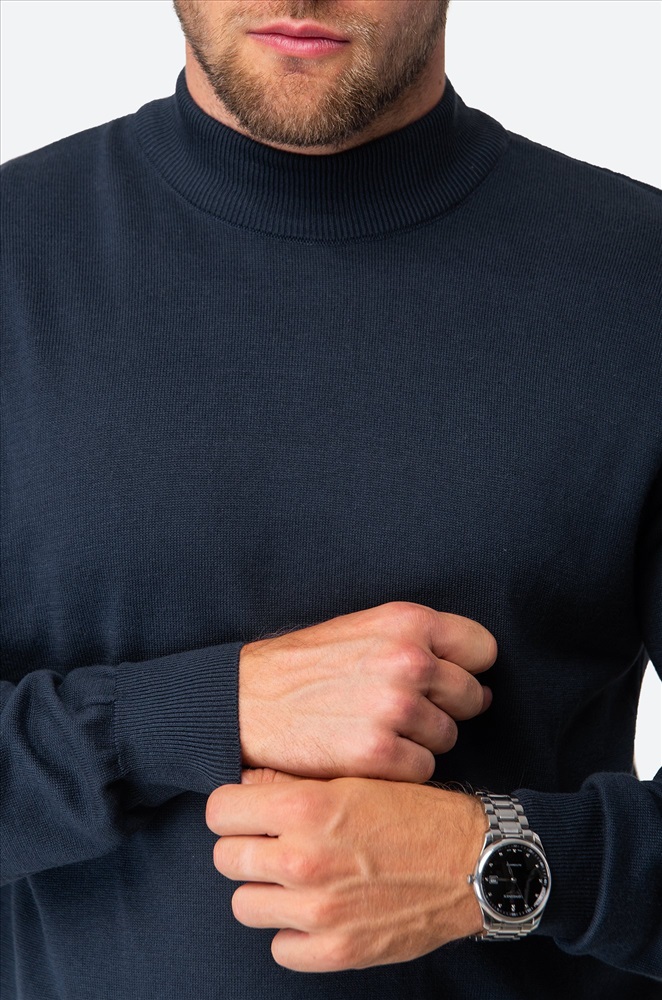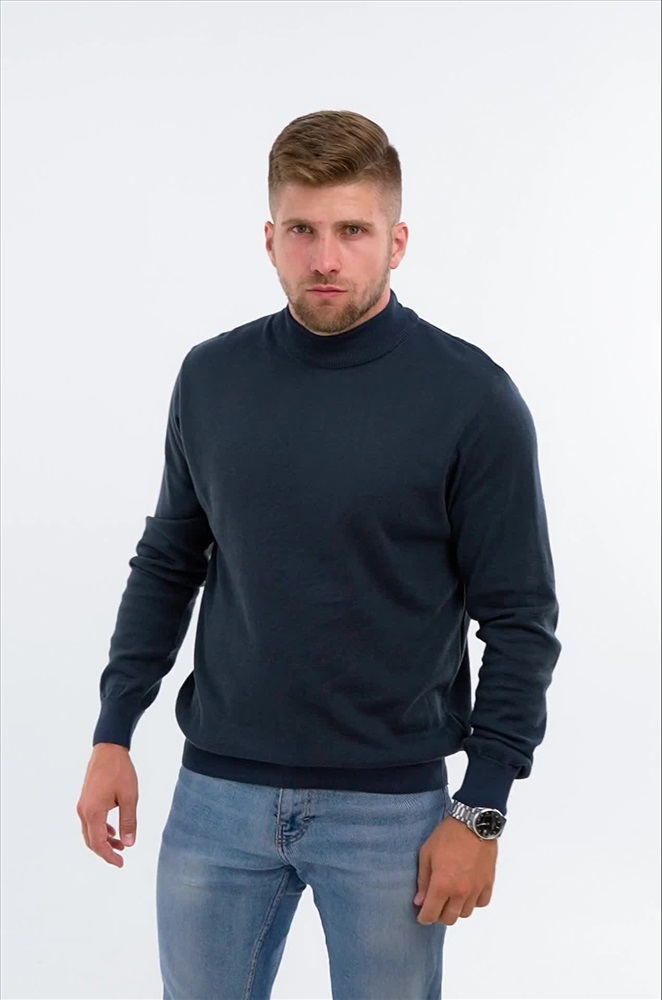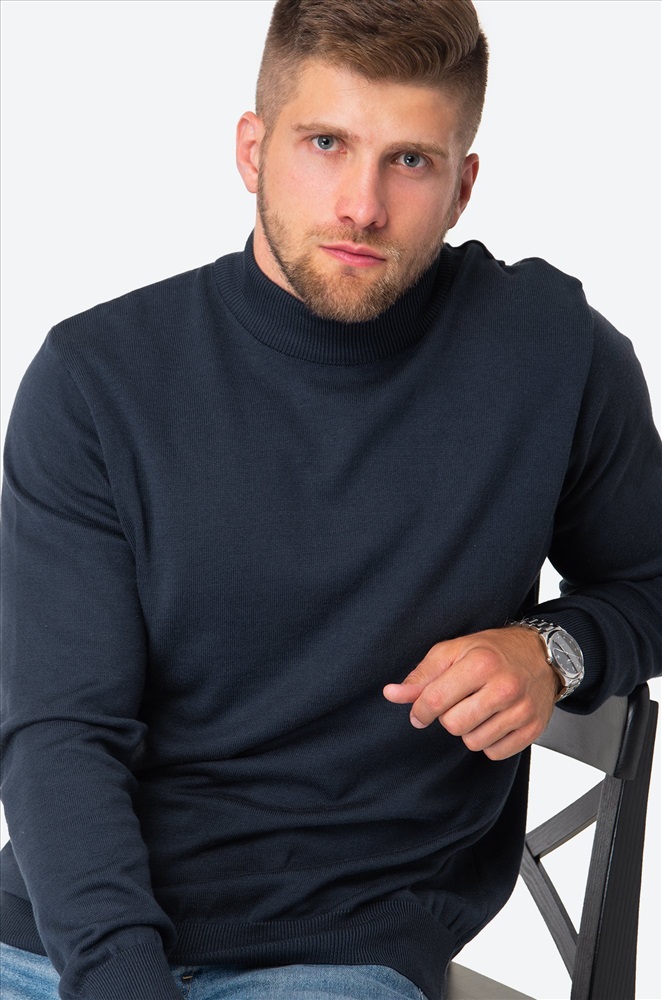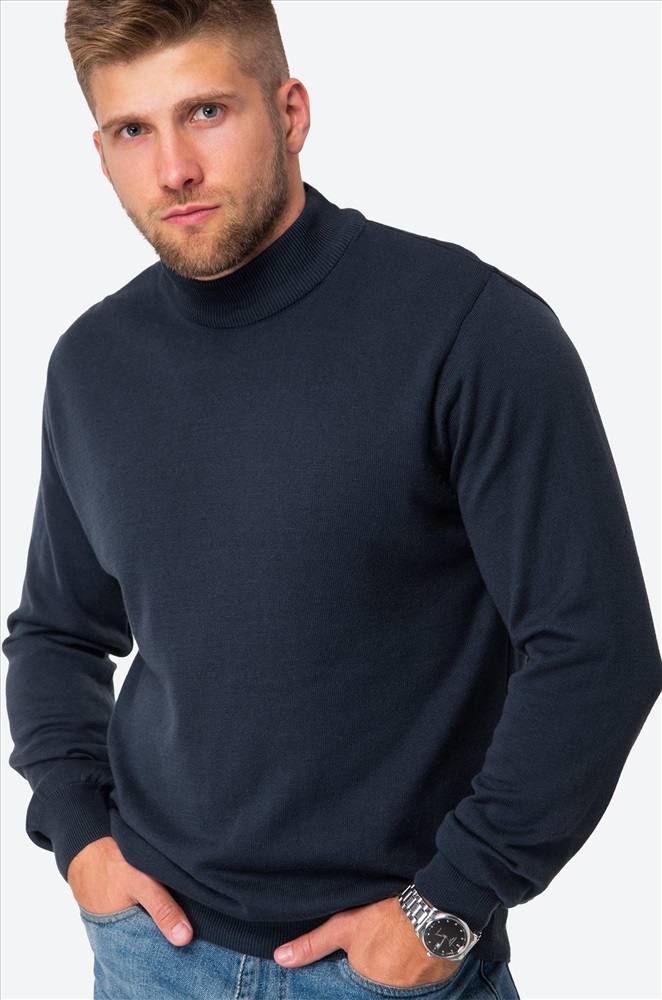 Синий джемпер с воротником-стойкой для мужчин выполнен из вязаного трикотажа: в нём будет уютно и тепло в прохладную погоду. Водолазка из мягкой хлопковой пряжи с акрилом невероятно приятный к телу. Короткий воротник не пережимает горло и отлично держит форму.