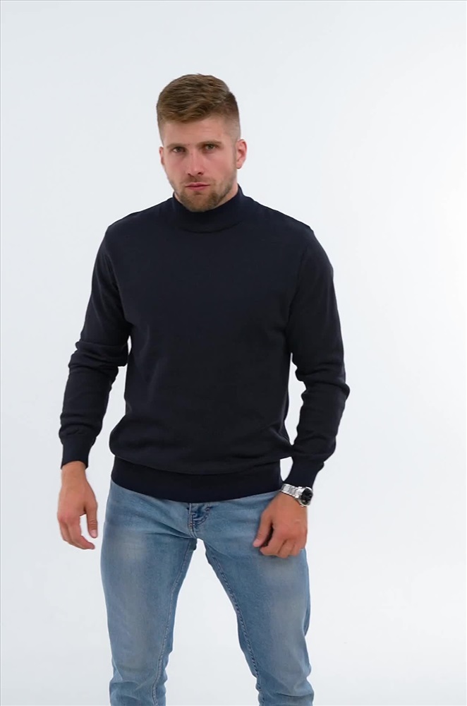 Синий джемпер с воротником-стойкой для мужчин выполнен из вязаного трикотажа: в нём будет уютно и тепло в прохладную погоду. Водолазка из мягкой хлопковой пряжи с акрилом невероятно приятный к телу. Короткий воротник не пережимает горло и отлично держит форму.