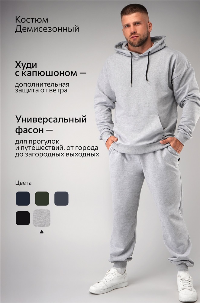 Мужской спортивный костюм из футера двухнитки — надежное решение для активного отдыха и туризма. Серый костюм для мужчин сочетает комфорт, функциональность и стиль.
