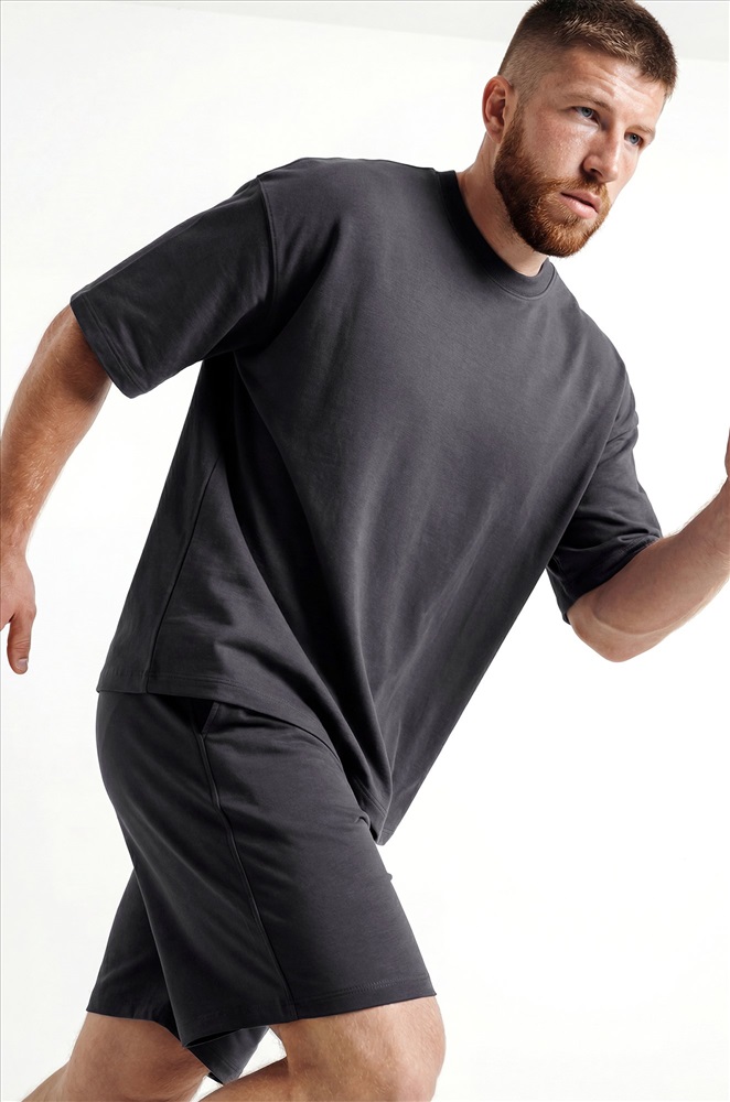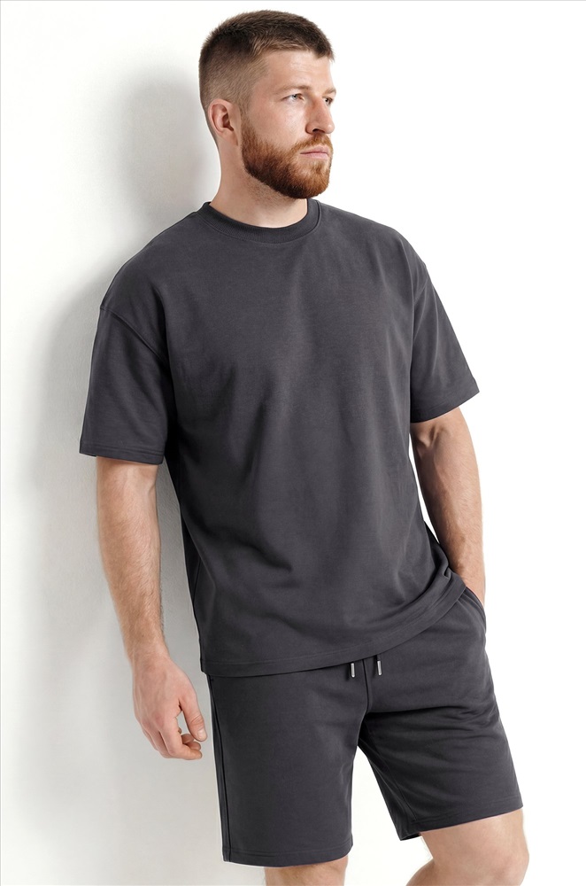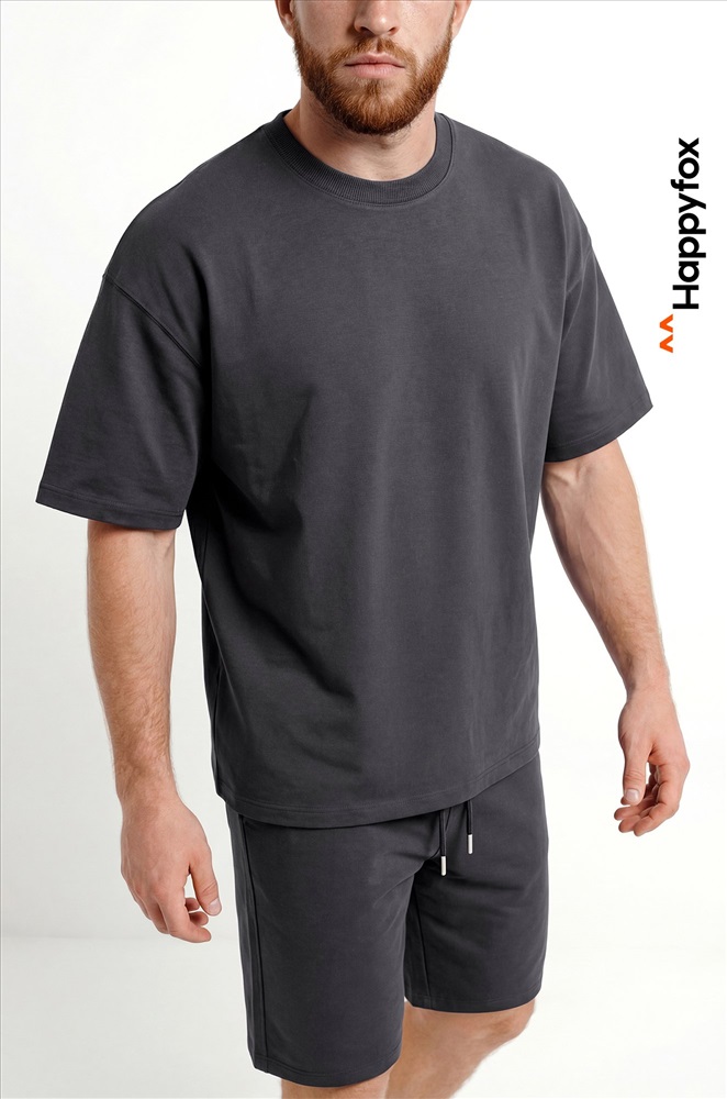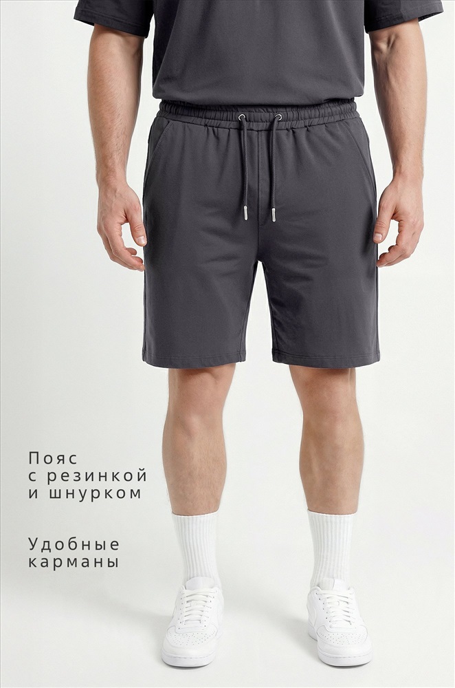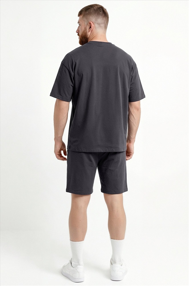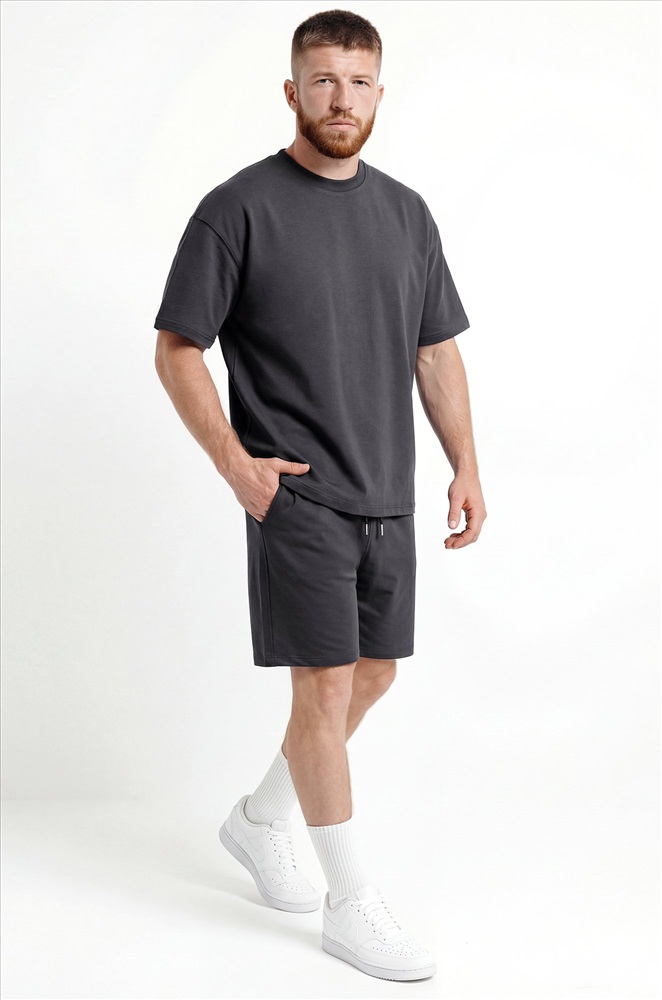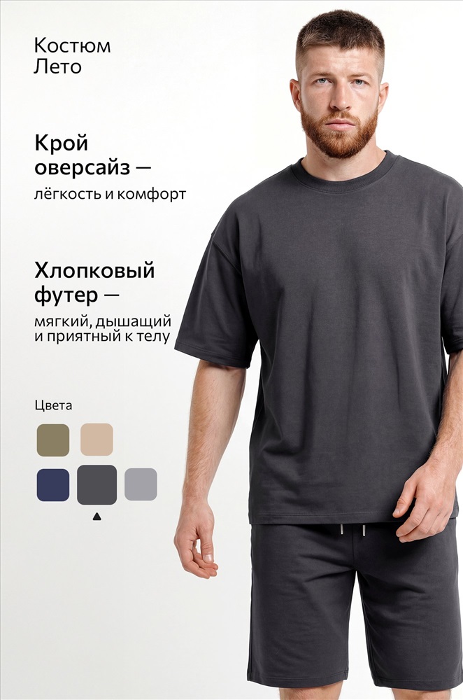 Преимущества: — спортивный костюм для мужчин выполнен из хлопкового трикотажа — футера с добавлением лайкры (плотность 240 г/м²); — натуральный хлопок приятен к телу, материал дышит и обеспечивает комфорт; — трикотажный костюм двойка включает свободную футболку оверсайз и удлиненные шорты; — расслабленный крой футболки со спущенным плечом подчёркивает стильный силуэт; — шорты на эластичном поясе со шнурком позволяют отрегулировать посадку; — боковые карманы делают костюм ещё удобнее для повседневного использования. Однотонный темно-серый костюм с шортами — универсальный вариант для дома, прогулок, тренировок и активного отдыха. Лёгкий и стильный летний костюм для мужчин — практичное решение на лето.