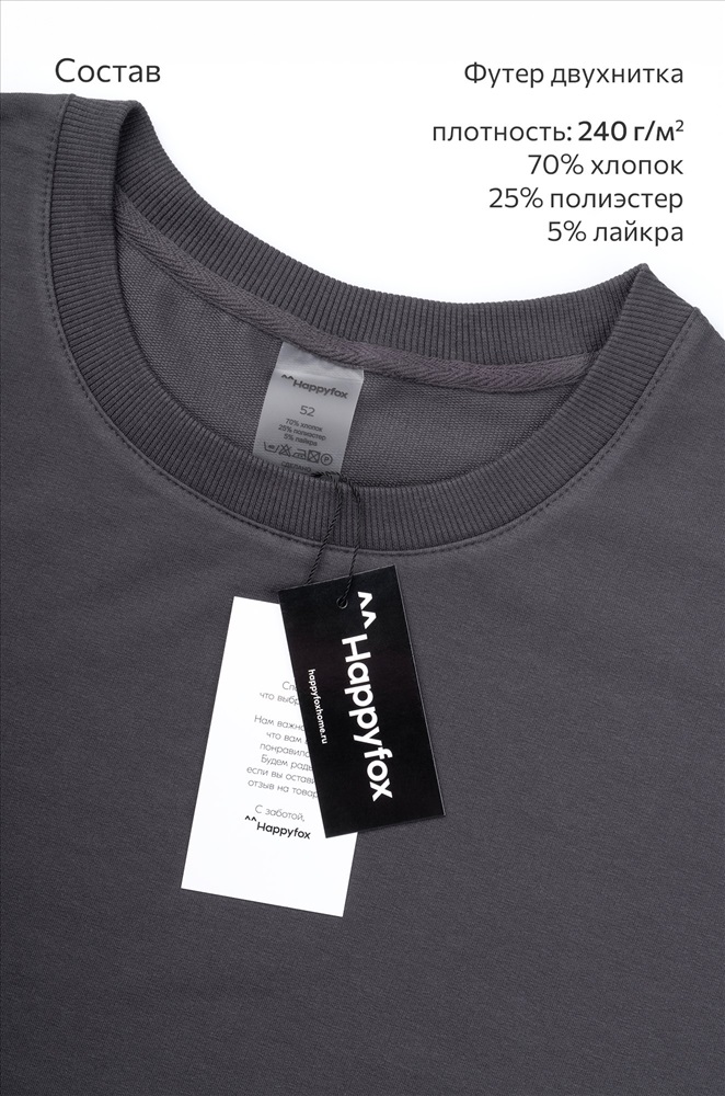 Бренд: Happyfox Страна: Узбекистан Состав: 70% хлопок, 25% полиэстер, 5% лайкра Материал: Футер двухнитка Плотность ткани: 240 г/м2