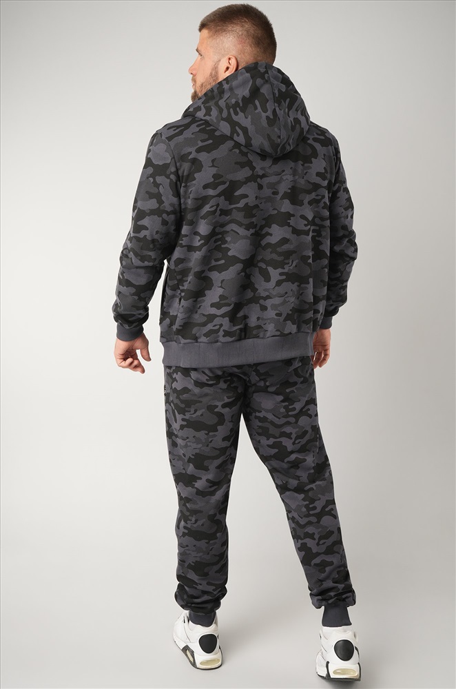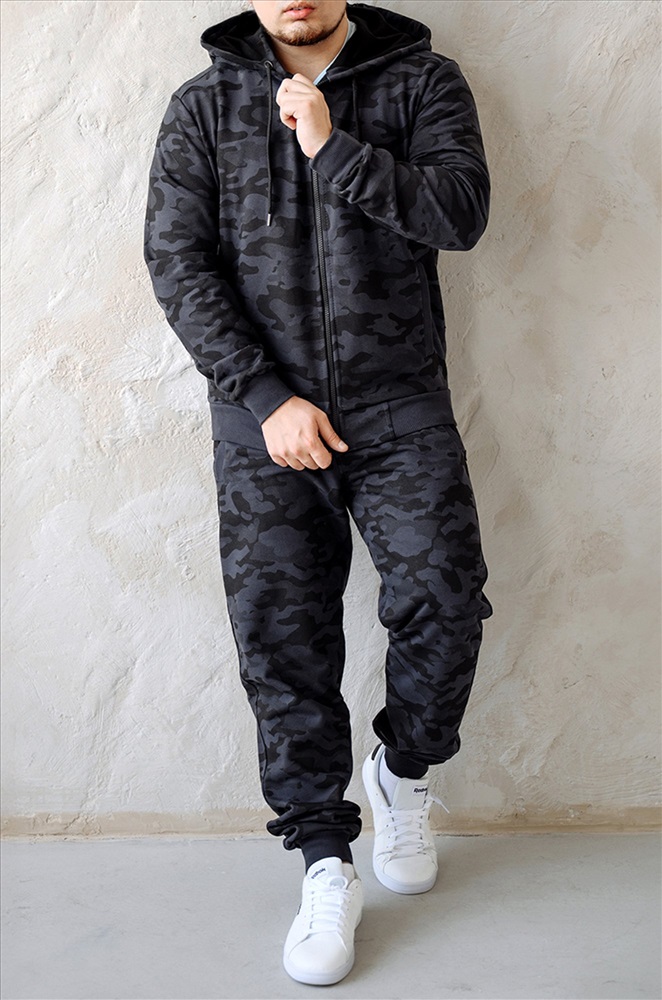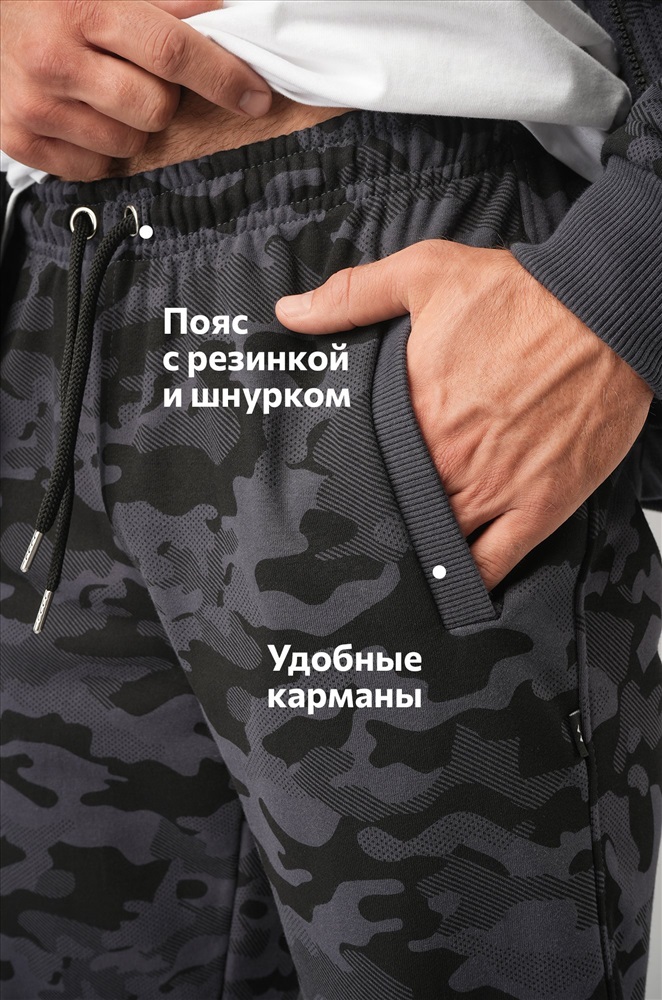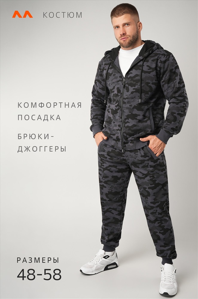 Мужской спортивный костюм выполнен из 100% хлопка, плотного футера трехнитки. Демисезонный камуфляжный костюм состоит из толстовки с капюшоном и брюк джоггеров. Мастерка с застежкой на молнию и карманами, капюшон регулируется по объему. Штаны дополнены карманами, пояс утягивается шнуром, по низу расположены эластичные манжеты. Тактический костюм для мужчин декорирован рисунком антрацитового цвета в стиле милитари. Натуральный хлопковый трикотаж хорошо пропускает воздух. Костюм из трикотажа станет лучшим дополнением экипировки рыбака, охотника и туриста. Темно-серый костюм с рисунком флора создан для полного комфорта как в спокойной домашней обстановке, так и в экстремальных ситуациях на охоте и рыбалке. Трикотажный костюм графитового цвета гармонично вписывается в уличный стиль и пригодится мужчинам во время занятий спортом. Широкий размерный ряд, есть большие размеры. Модель Артем, его рост 172 см, параметры 113-82-100. На нем 52 размер.