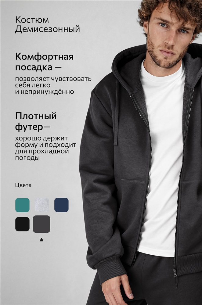 Преимущества: — однотонный темно-серый костюм со штанами выполнен из плотного футера трехнитки; — костюм с толстовкой с глубоким капюшоном дарит уют и комфорт; — благодаря эластичными манжетам рукава и штанины не задираются при движении; — карман-кенгуру согревает руки в прохладную погоду; — пояс со шнурком позволяет регулировать посадку брюк; — благодаря добавлению полиэстера хлопковый костюм сохраняет форму и цвет даже после многократных стирок; — костюм графитового цвета идеален для осени и весны; — спортивный костюм с брюками подойдет для пробежек и прогулок. Трикотажный костюм из хлопка идеален для осенних и весенних дней.