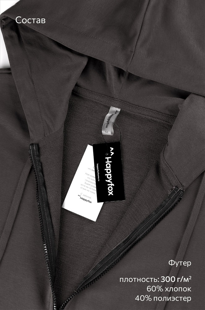 Бренд: Happyfox Серия: Happyfox- Sports Family Страна: Узбекистан Состав: 60% хлопок, 40% полиэстер Материал: Футер трёхнитка Плотность ткани: 300 г/м2 Цвет: графит