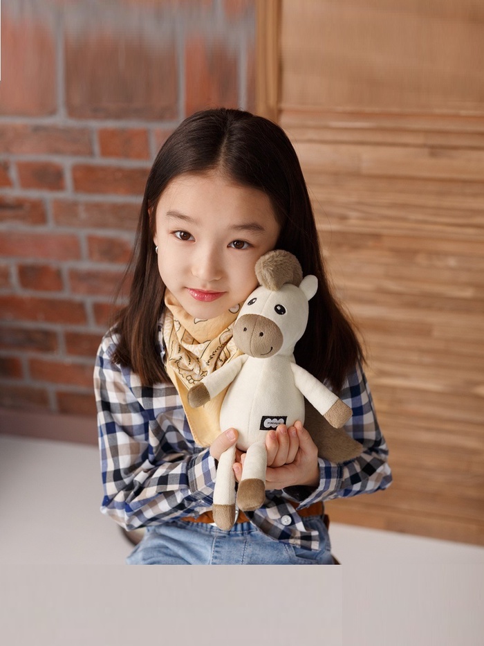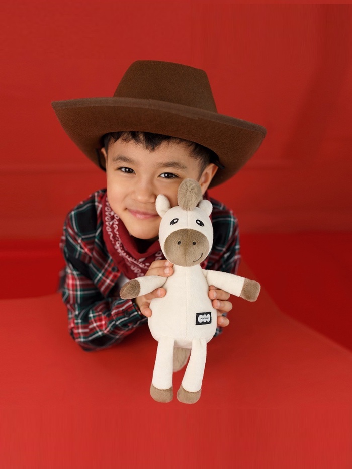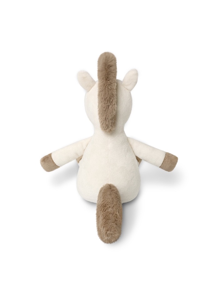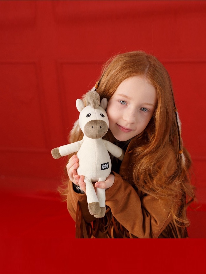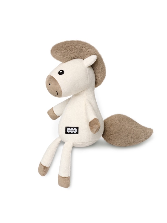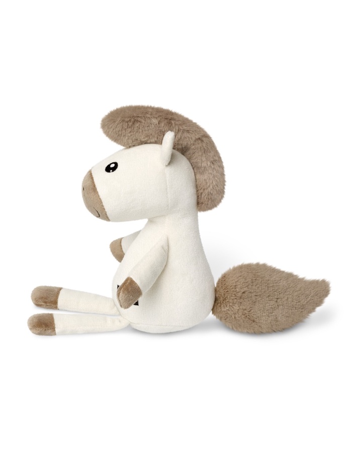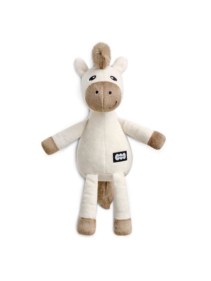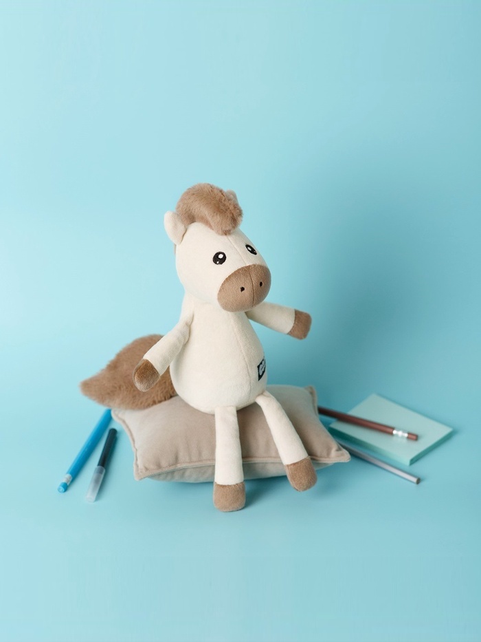 - Игрушка выполнена в виде милой лошадки с мягкой текстурой искусственного меха.
