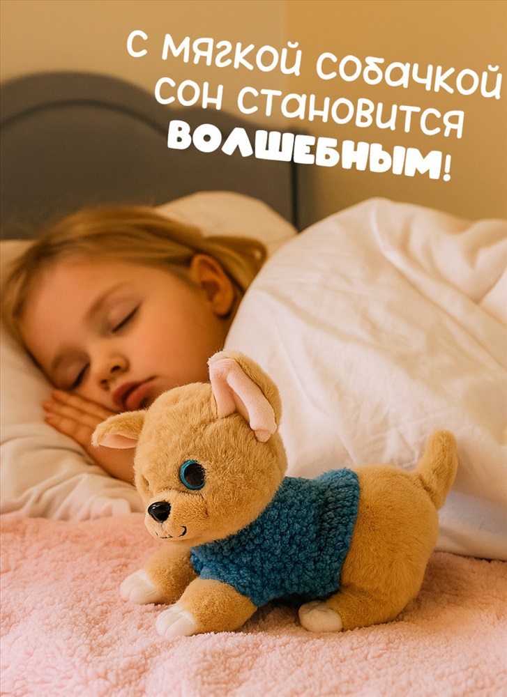 Маленькая плюшевая собака обладает музыкальной функцией, которая активируется при нажатии на животик, издавая "гав-гав". Благодаря компактным размерам, игрушка легко помещается в детскую кроватку или на полку, становясь частью интерьера и любимым другом вашего ребенка.