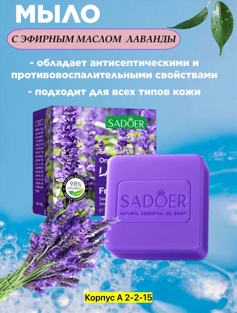 Мыло с эфирным маслом лаванды для умывания 100гМыло с эфирным маслом лаванды - гармония для души и телаПозвольте себе окунуться в мир спокойствия и умиротворения вместе с мылом от SADOER!