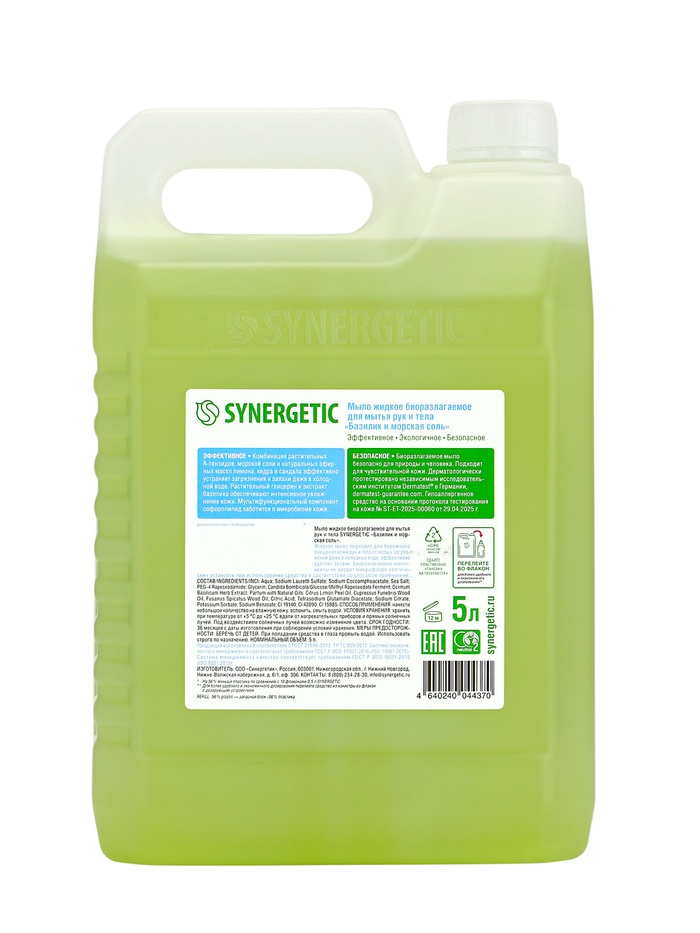 Габариты: 18,5 x 13,5 x 28 Страна: Россия В боксе: 4 шт Состав: См. на упаковке Материалы: см. на упаковке Фасовка: по 1 шт Индивидуальная упаковка: Без упаковки Сертификат: ЕАС Вес, г/Объём, мл: 5000 Вид упаковки: Пластиковая бутылка Область применения: Для тела, Для рук Аромат: Морская соль, Базилик Тип: Жидкое Вид мыла: Туалетное Жидкое мыло SYNERGETIC "Базилик и морская соль" — экологичное средство для мягкого очищения кожи рук и тела. Благодаря биоразлагаемой формуле на основе растительных компонентов оно эффективно удаляет загрязнения, сохраняя природный баланс кожи и не пересушивая её. Аромат свежего базилика в сочетании с морской солью дарит ощущение лёгкости и бодрости, наполняя энергией на целый день. Преимущества: